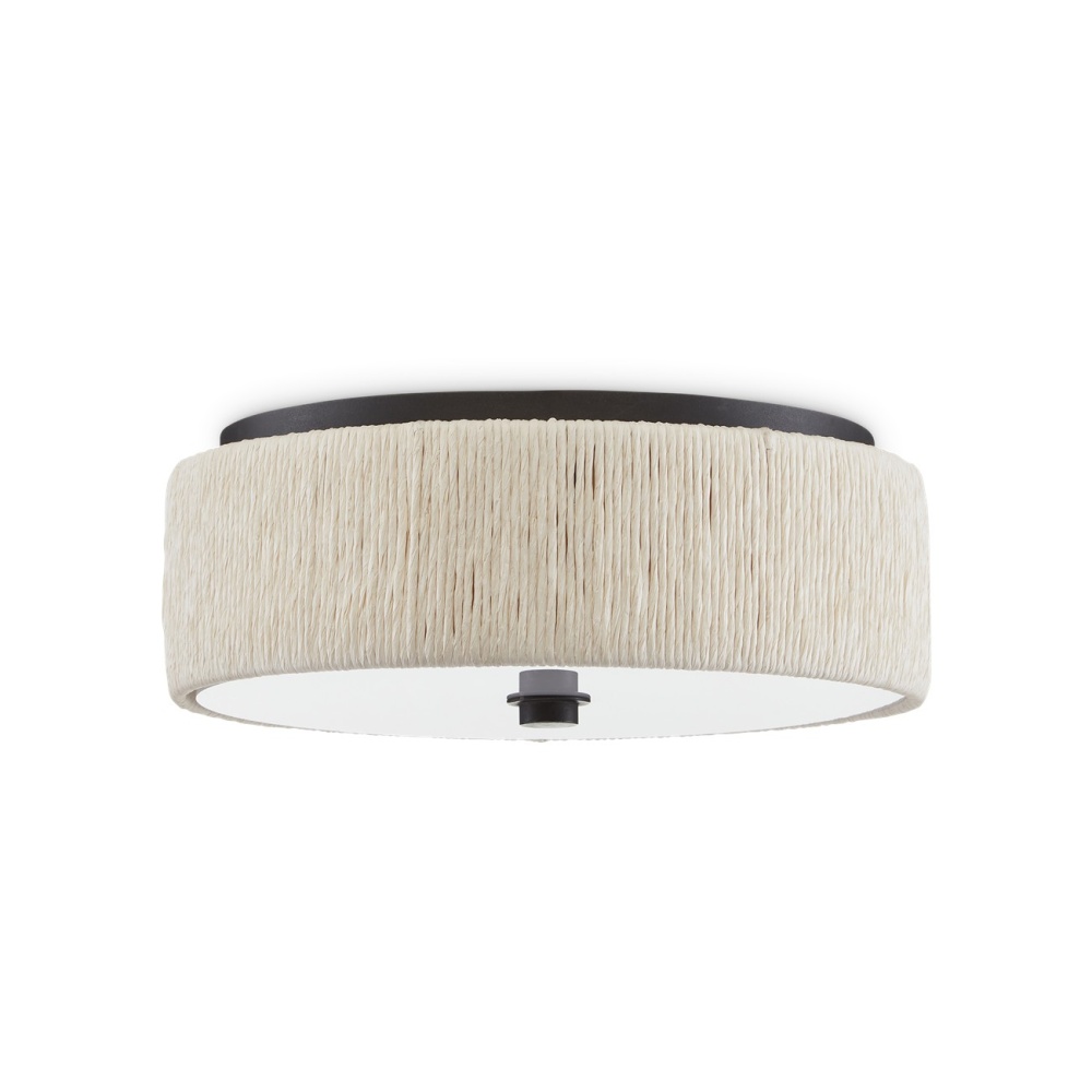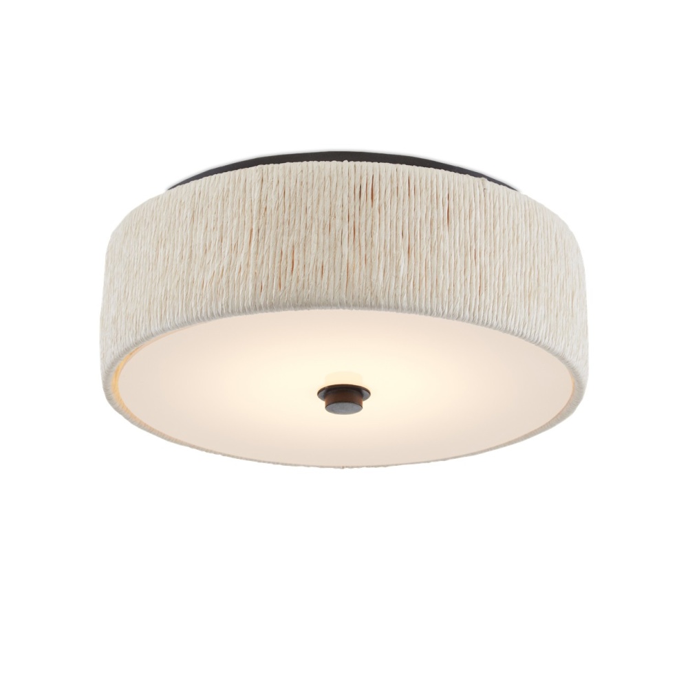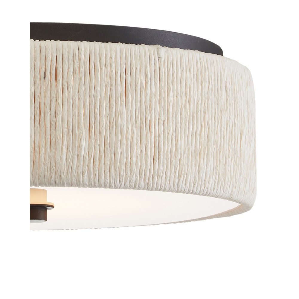 The exterior of the shade of the Tyrone Flush Mount is wrapped in recycled paper that has been twisted like braided hair. The paper is painted white to blend with the white diffuser affixed to this ivory flush mount. The wrought iron ceiling mount and finial nicely contrast the crispness of this design. The Tyrone is fitted with integrated LED technology.