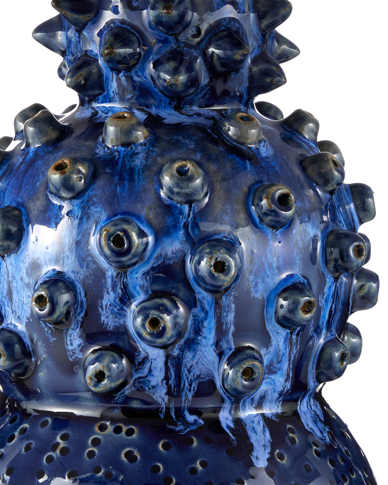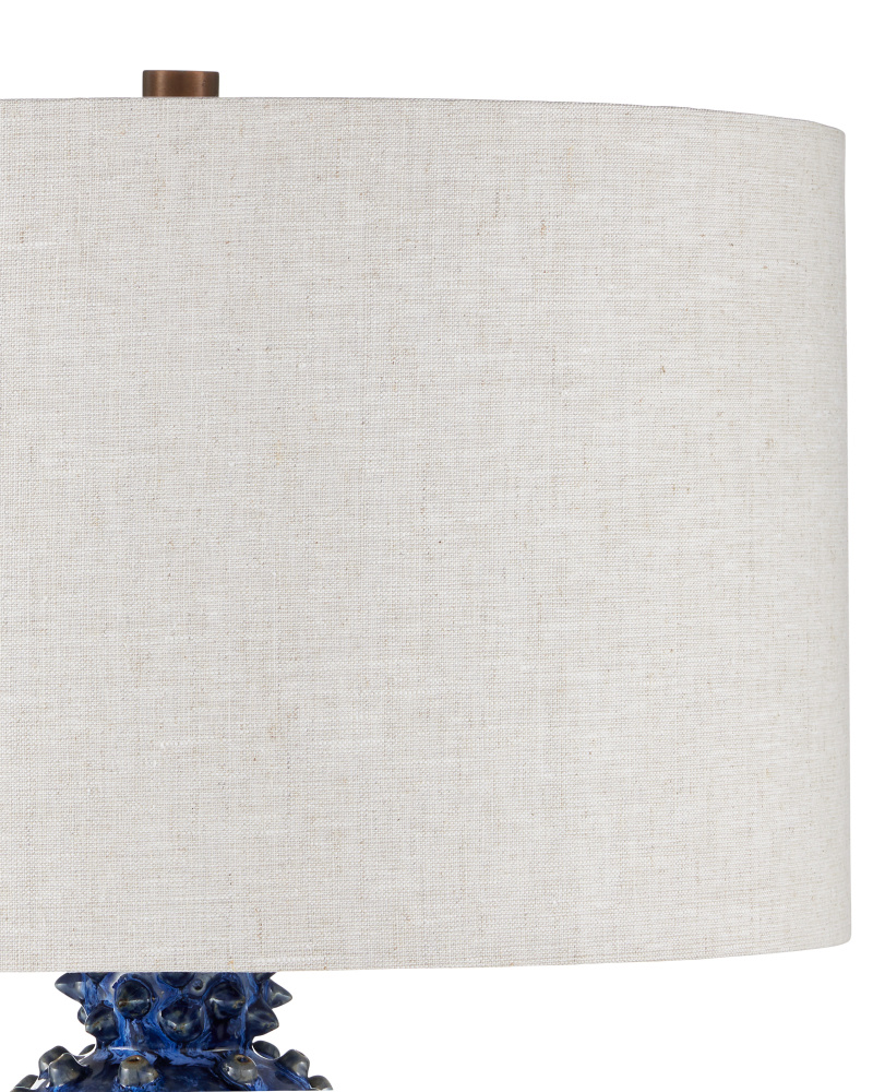 Stacked geometric shapes that represent coral and urchins are fired into an ornamental column to create the Undersea Dark Blue Table Lamp. Made of dark clay ceramic covered in a blue reactive glaze, the lovely creation was created by a group of women who live at the border of Burma and Thailand. Their agile hands manipulate, pinch, and affix textural decorative elements to the surfaces of their artistry, making each piece they create unique.