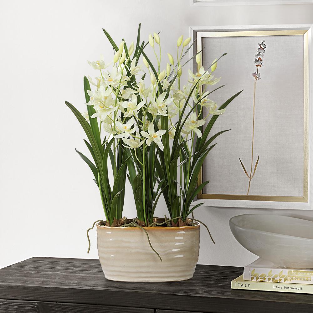 Sprays Of Cream Cymbidium Orchids With Lush Green Foliage Are Nestled Into A Textured, Tan Glazed Ceramic Planter With Faux Soil.