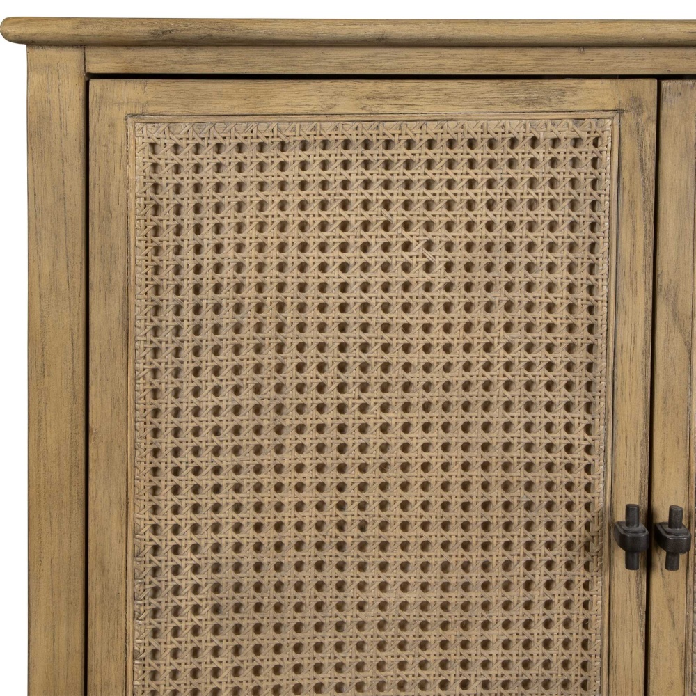 Mid Century Inspired With Accents Of Natural Rattan Cane, This Two Door Cabinet Features Mindi Solids And Veneers Finished In A Soft Oak Stain. The Two Doors Have Metal Hardware Finished In Dark Gunmetal.