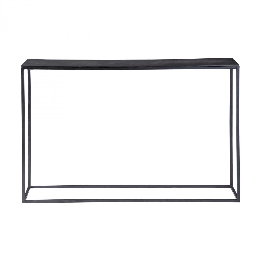 Simplistic Industrial Style Console Table, Constructed in An Aged Black Iron Featuring A Cast Textured Aluminum Slab Top Finished in A Plated Antique Bronze.