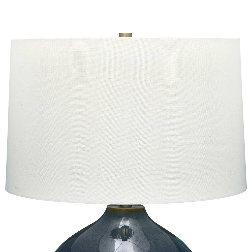 This Stunning Lamp Features A Mottled Deep Blue Ceramic Base With Rustic Undertone And Brass Plated Accents. The Slightly Tapered Round Hardback Shade Is Covered In A White Linen Fabric.