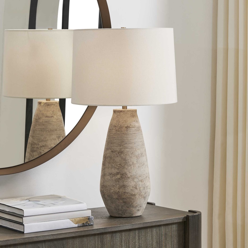 Showcasing A Rustic Casual Look, This Ceramic Table Lamp Features A Distressed Aged Light Gray Wash With Subtle Ribbed Texturing And Dark Brown Undertones, Accented By Antique Brass Plated Details. The Slightly Tapered Round Hardback Shade Is Covered In A Warm White Linen Fabric.