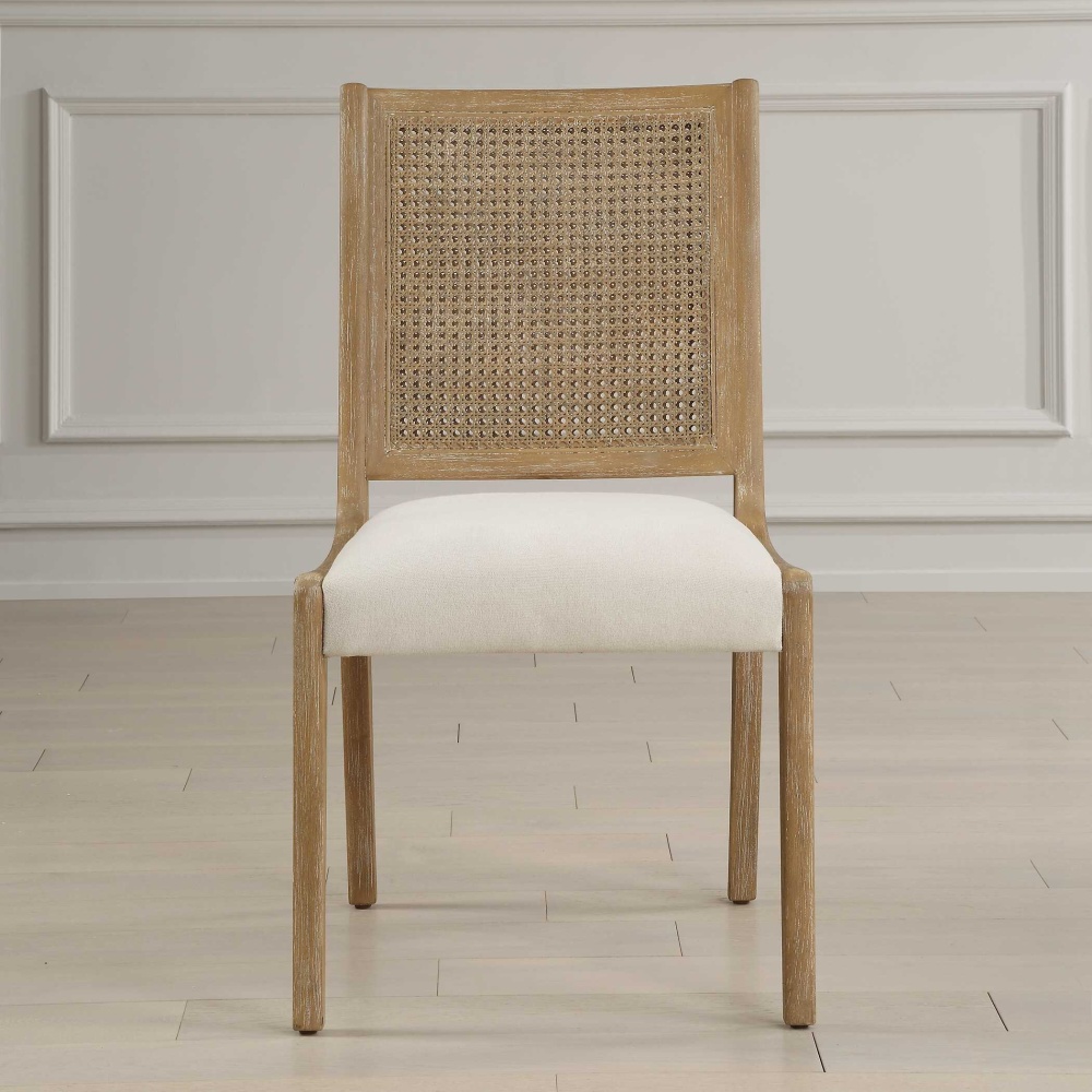 Casual Coastal Inspired Styling With Elevated Details In The Swooped Seat Frame In Solid Wood, Finished In Light Oak Ceruse. The Supportive Rattan Caned Back Is Paired With A Plush Seat Upholstered In A Frost Toned Polyester Fabric With A Toxin-free, Eco Friendly Treatment To Help Resist Water Based Stains. Sold As A Set Of 2. Seat Height Is 19".