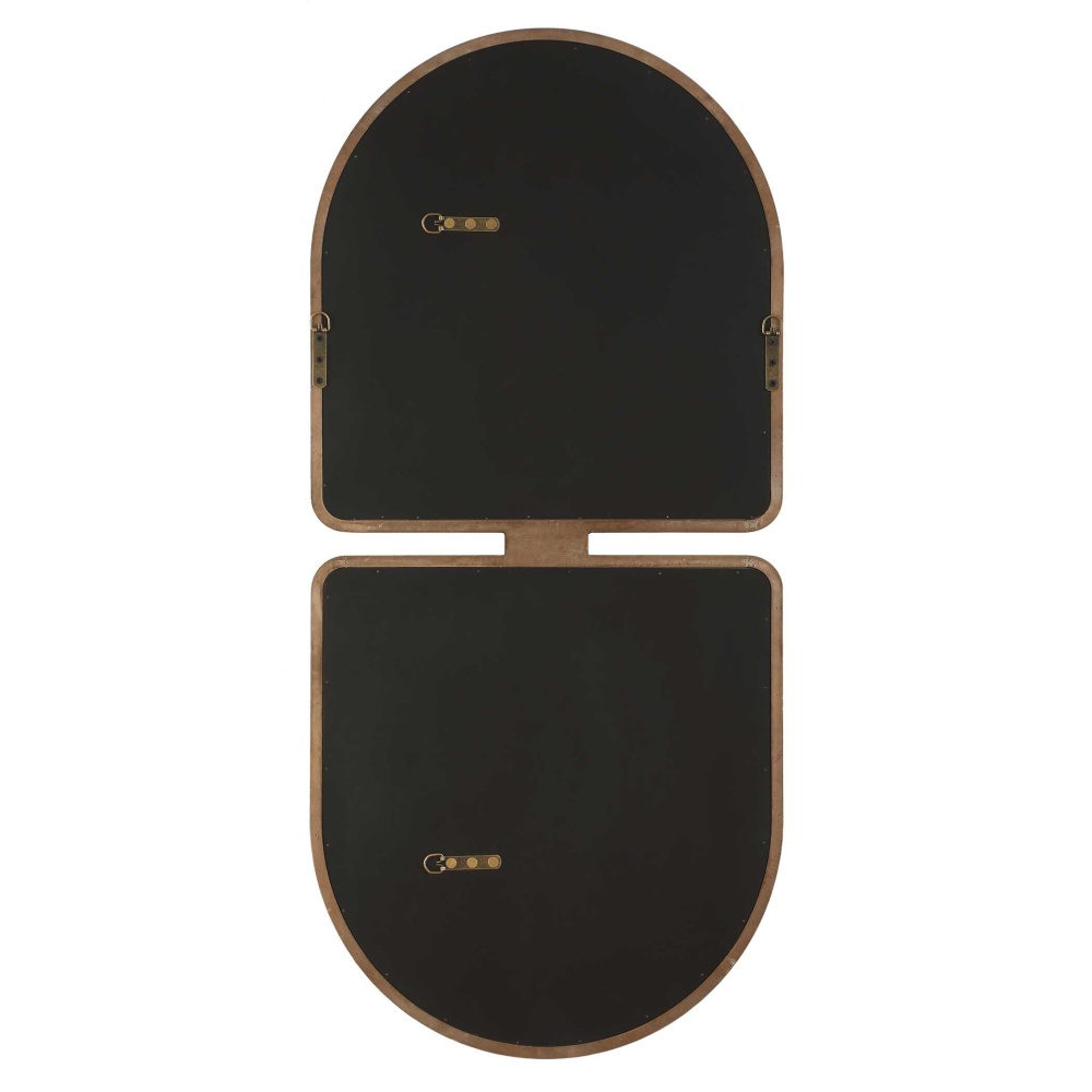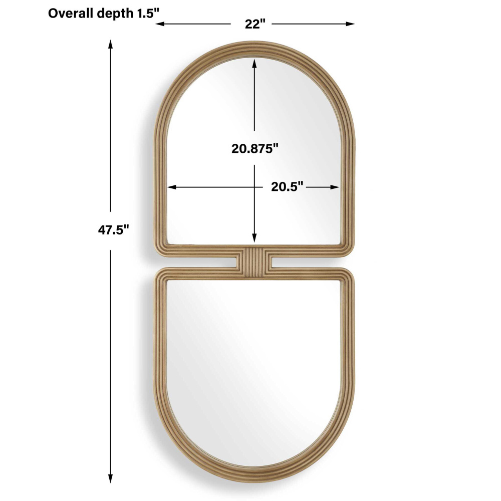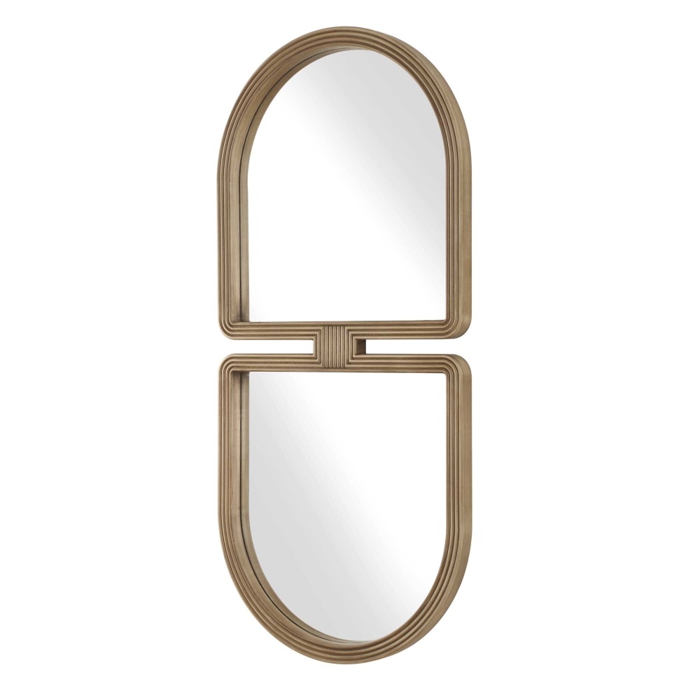 A Modern Twist On Art Deco Design, This Mirror Breaks Away From Traditional Shapes With Its Eye-catching Silhouette. It Features A Sleek, Wooden Frame With Grooved Out Channels Finished In A Lightly Antiqued Gold. The Contrasting Forms Create A Visually Dynamic Piece That Complements Both Classic And Contemporary Interiors.