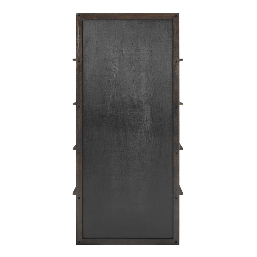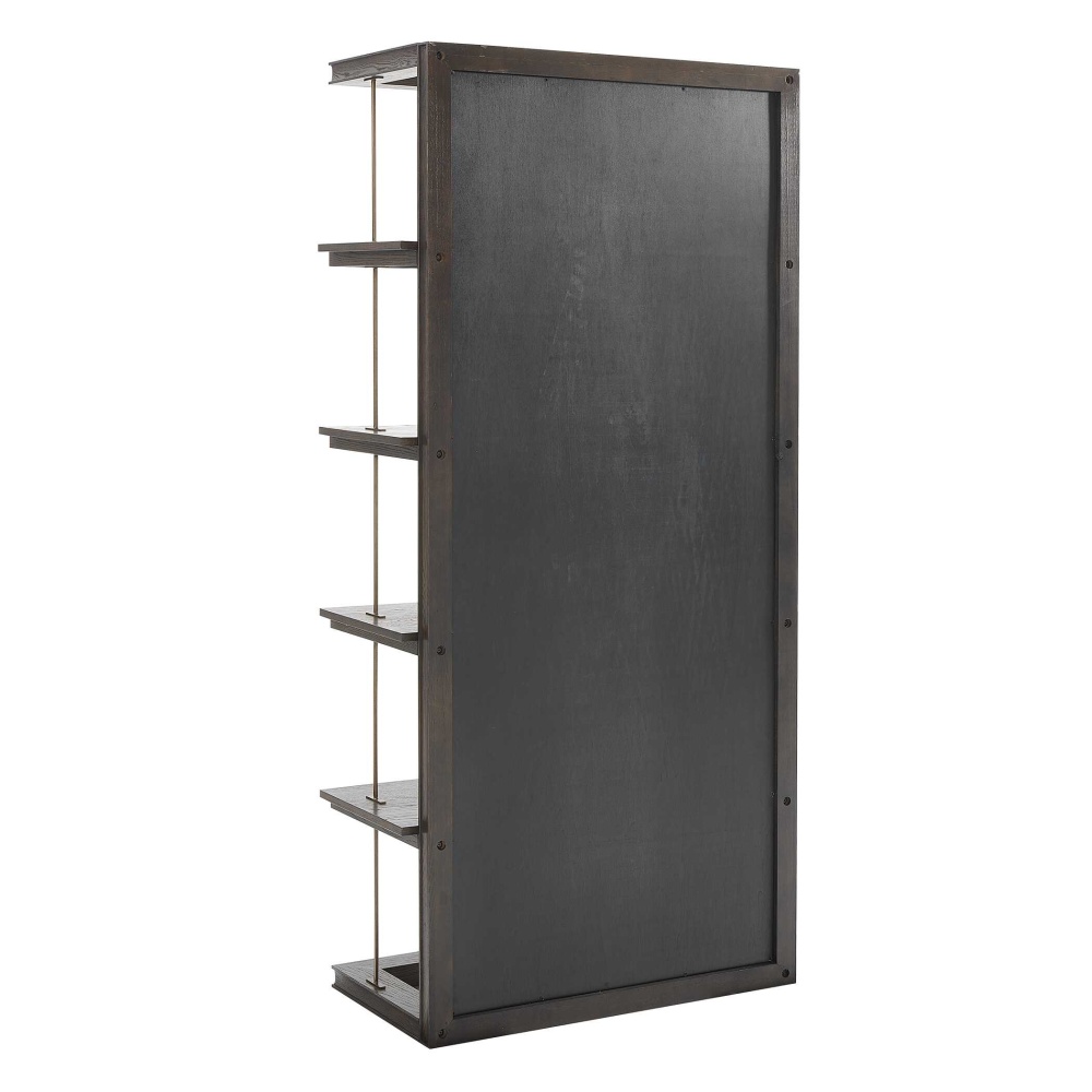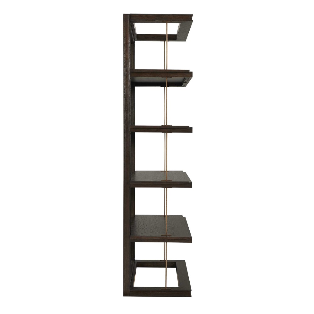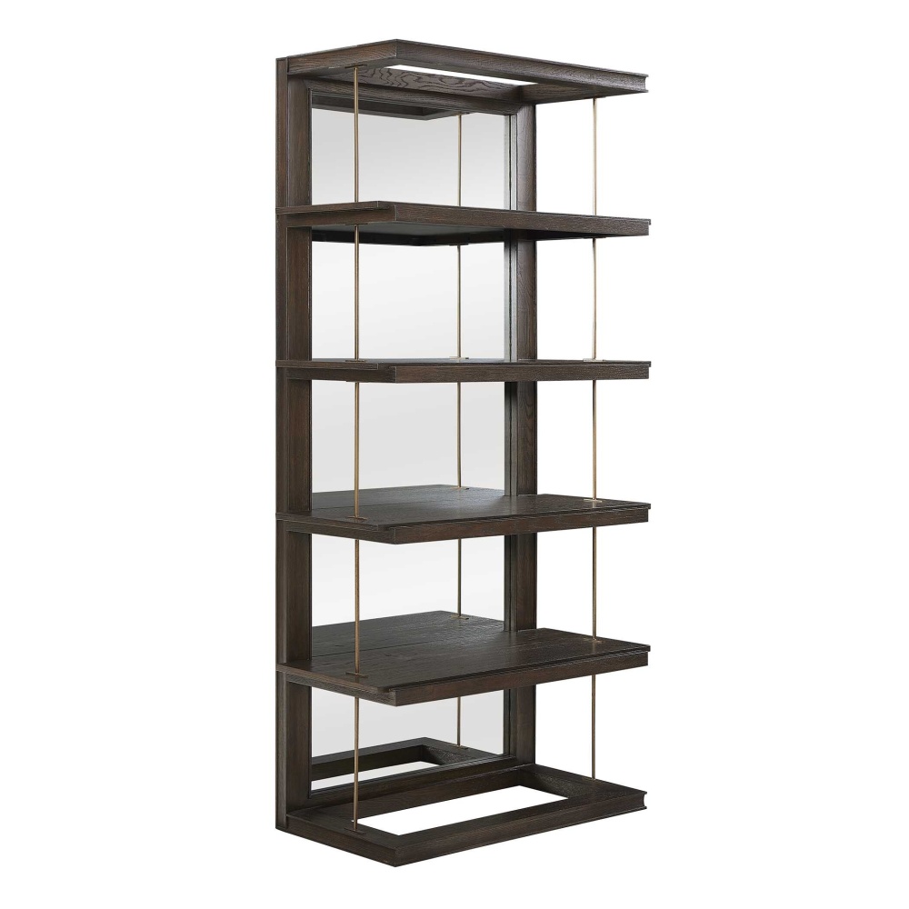 This Elegant Etagere Combines A Classic Dark Walnut Finish With Gold Accents. Crafted From Oak, It Features Five Open Shelves For Displaying Your Favorite Items. The Mirrored Back Adds Depth And Light To Your Space, While The Gold Iron Bars Create A Striking Visual Contrast.