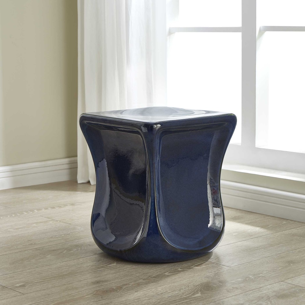This Sculptural Stool Made Entirely Of Earthenware Clay Features Dramatic Scooped-in Sides Covered In A Deep, Lustrous Blue Glaze. Due To The Nature Of Fired Glazes On Pottery, Finishes Will Vary Slightly. May Be Used Outdoors, But Protection From Freezing Temperatures Is Recommended.