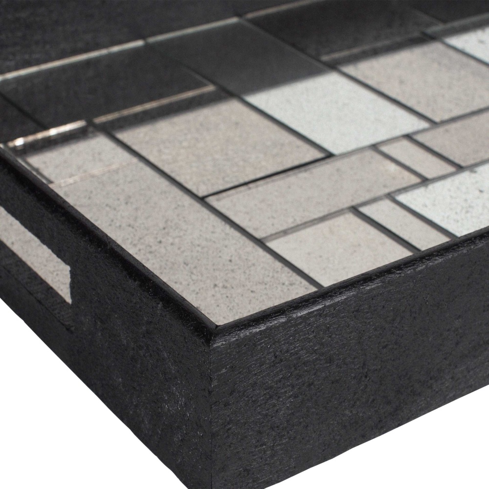 Elevate Your Hosting Experience With This Sleek Black Mango Wood Tray Featuring A Striking Antique Mirrored Mosaic Design. With Built-in Handles And A Contemporary Aesthetic, It's The Perfect Blend Of Function And Style For Any Space.