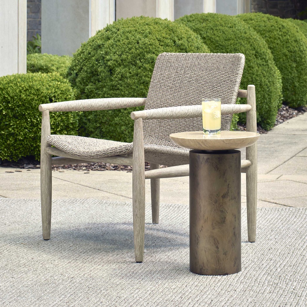This Contemporary Accent Table Showcases A Captivating Contrast Between Its Sleek, Antique Brass Iron Base And Its Travertine Top. Because Of The Natural Characteristics Of Stone, Each Piece Will Have Unique Color And Variation. Suitable For Both Indoor And Outdoor Use.