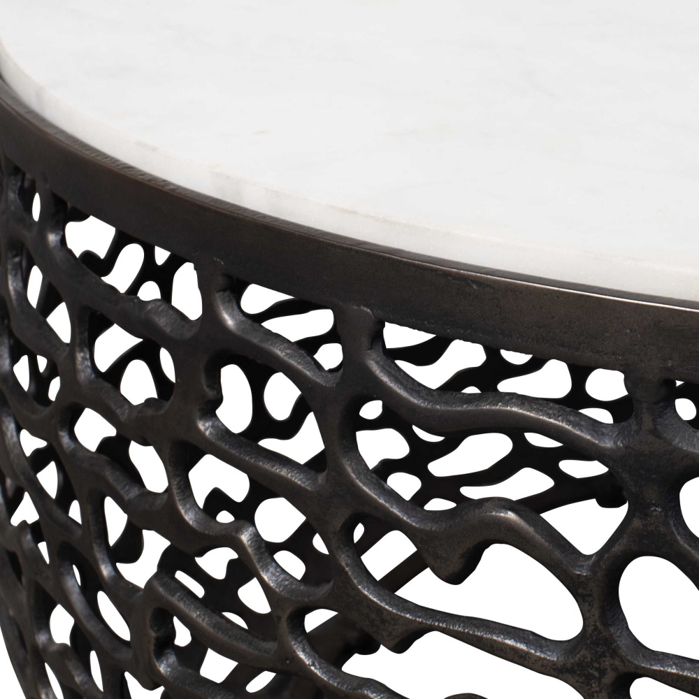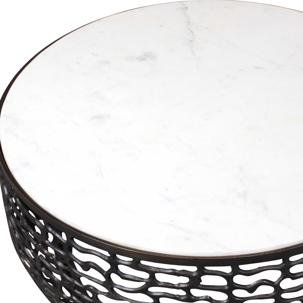 This Striking Coffee Table Boasts A White Marble Top With Subtle Gray Veining, Creating A Luxurious Contrast With The Warm, Dark Bronze Finish Of Its Intricately Patterned Cast Aluminum Base. Due To The Nature Of Natural Stone, Every Piece Will Vary Slightly Ensuring Yours Is Unique. Suitable For Both Indoor And Outdoor Use.