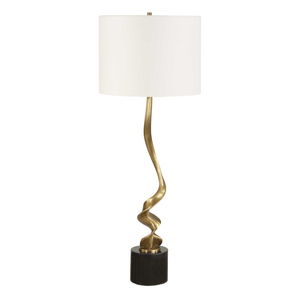 This Cordless Table Lamp Presents A Captivating Visual With Its Fluidly Twisting Metal Base In Antique Brass, Ascending From A Substantial Black Marble Foot. A Round Hardback Shade Covered In A Crisp White Linen Completes The Design. This Lamp Ships With A Rechargeable LED Lightsouce With Dimmable Features, A Remote And USB To USB-C Charging Cord.