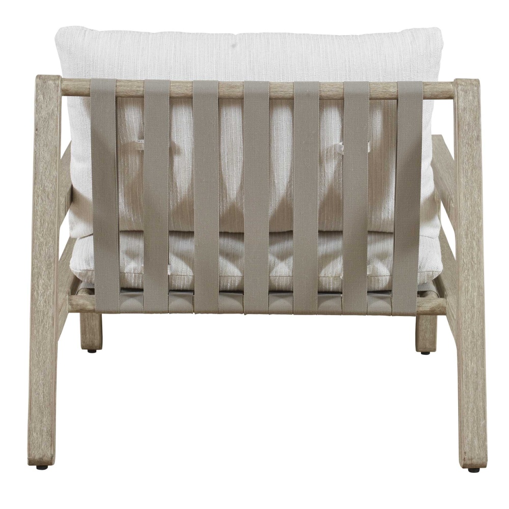 The Strapped Outdoor Lounge Chair Features A Casual, Laid Back Styling With A Mahogany Wood Frame In Cerused Wheat Accented With Taupe Back Straps Adding Function And Style. The Plush Cushions Are Upholstered In An Ivory Rattan Textured Sunbrella Solution Dyed Acrylic.