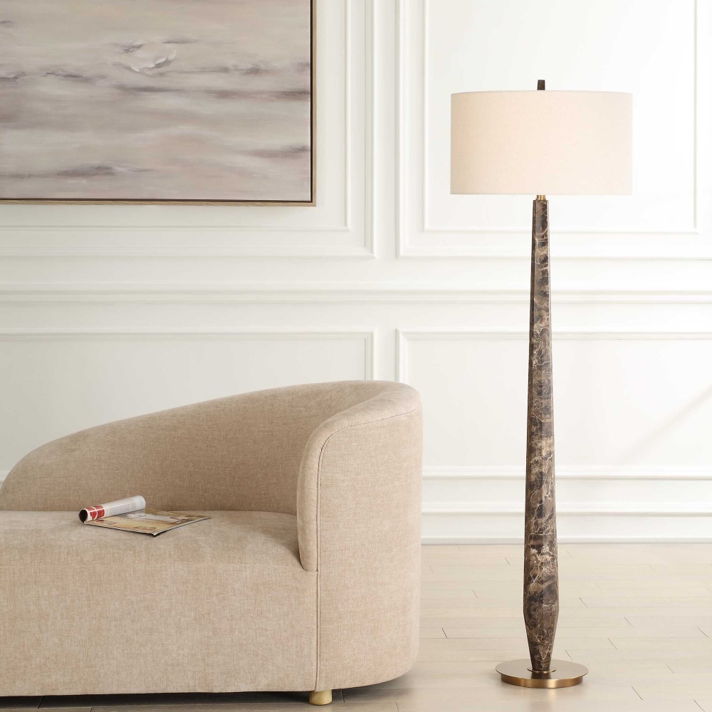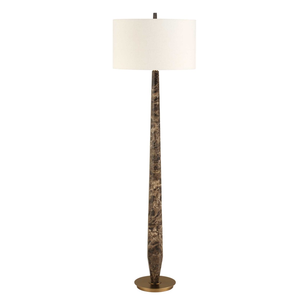 The Tyree Floor Lamp Is Crafted From Emperador Brown Marble, Showcasing Sharp Faceted Edges In Signature Warm Tones And Intricate Light Veining. It Is Accented With Brass Plated Accents And A Complementary Foot. A Round Hardback Drum Shade Covered With An Off-white Linen Fabric With Natural Slubbing Completes The Piece. True To The Nature Of Natural Materials, Each Piece Will Have Unique Marbling And Veining Throughout.