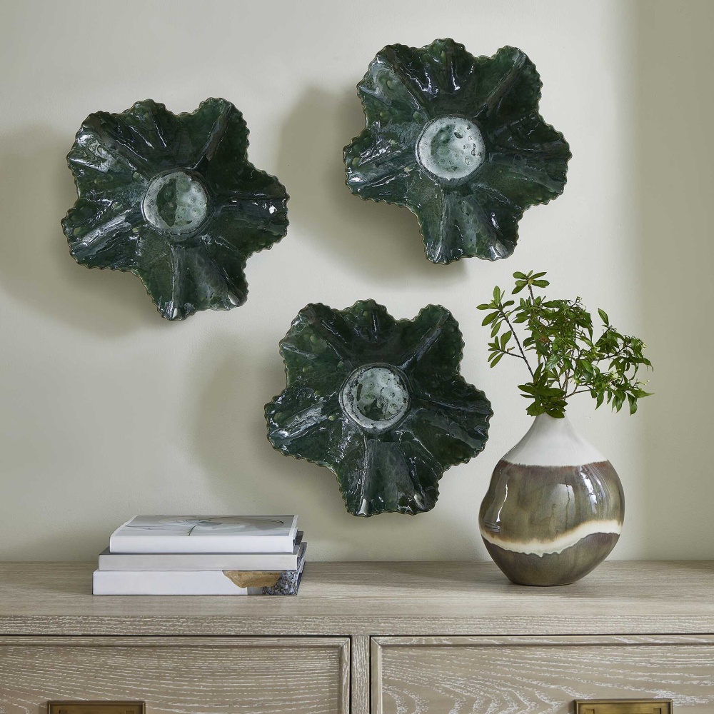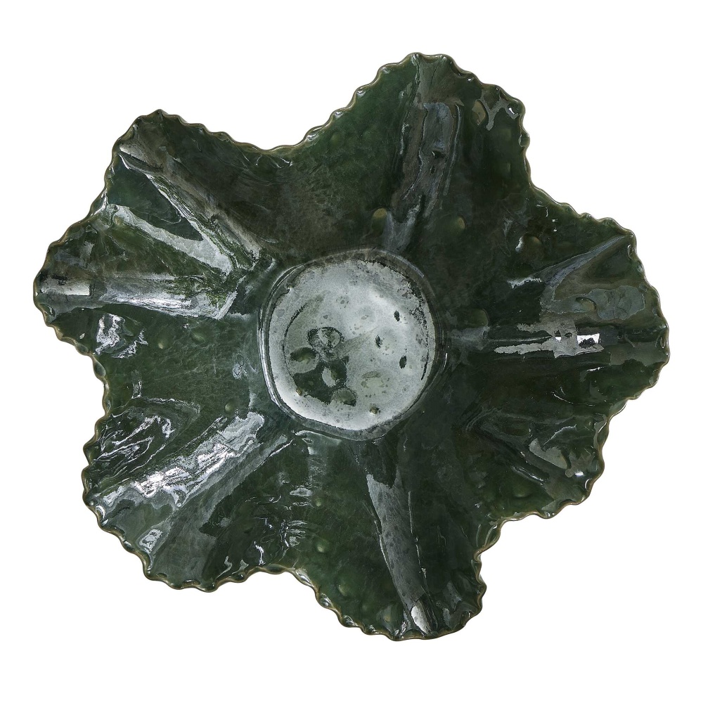 Inspired By Nature, This Striking Bowl Features An Organic, Flower-like Form With A Rich, Glossy Emerald Glaze. Its Fluid Shape And Intricate Textures Make It A Stunning Statement Piece, Perfect For Adding An Artistic Touch To Any Space. May Be Hung On Wall Or Used As Tabletop Accessory. Safe For Outdoor Use, But Protection From Freezing Temperatures Is Recommended.