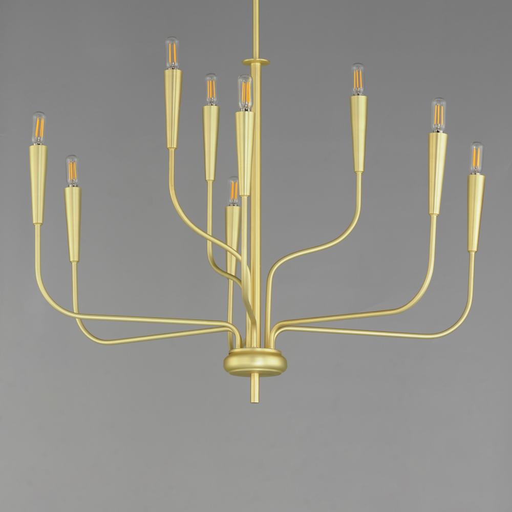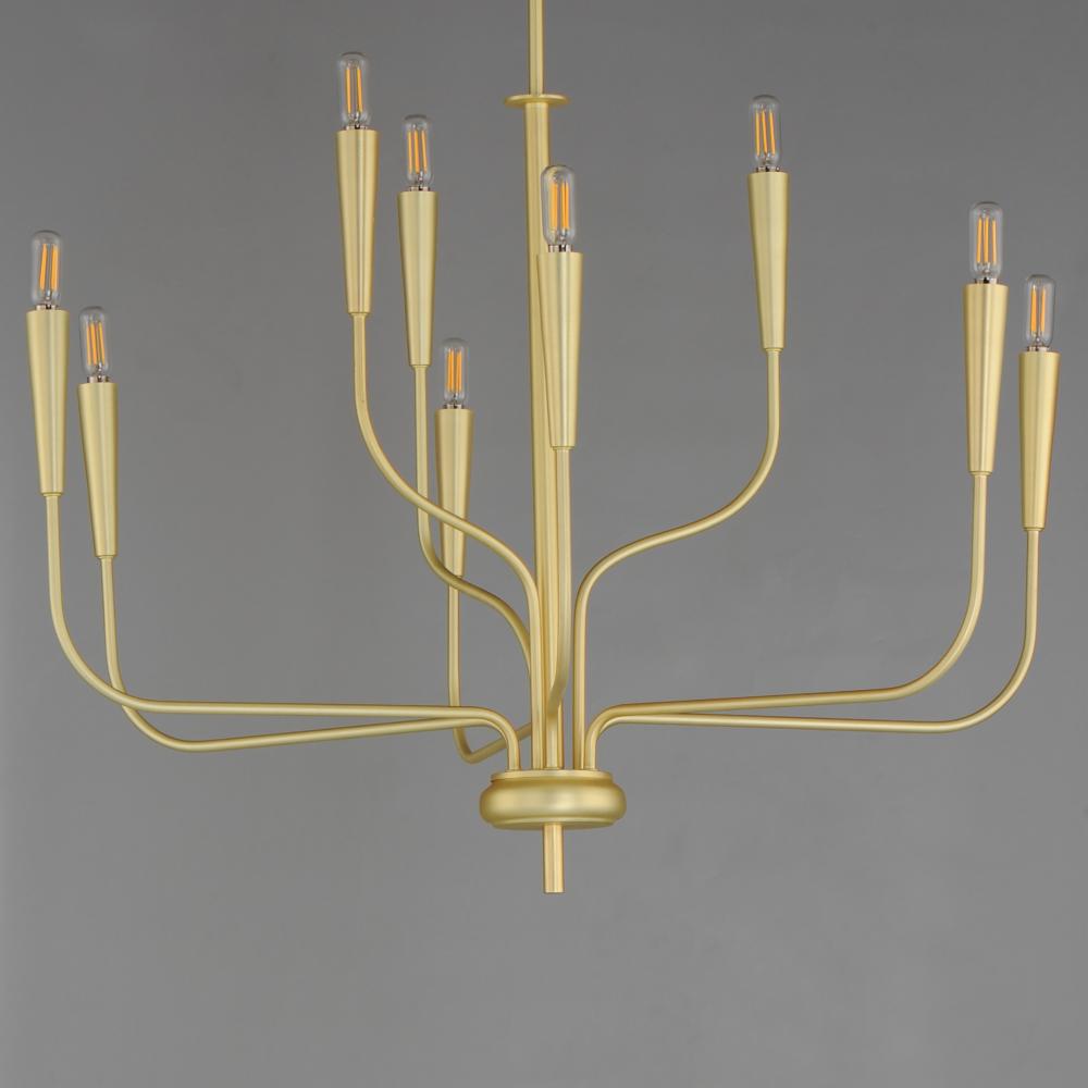 A simple candle style chandelier is given a modern edge with tall tapered candle covers that sit at the ends of curved arms without a bobeche beneath them. Available in Satin Brass or Matte Black, the collection compliments many architectural interiors and