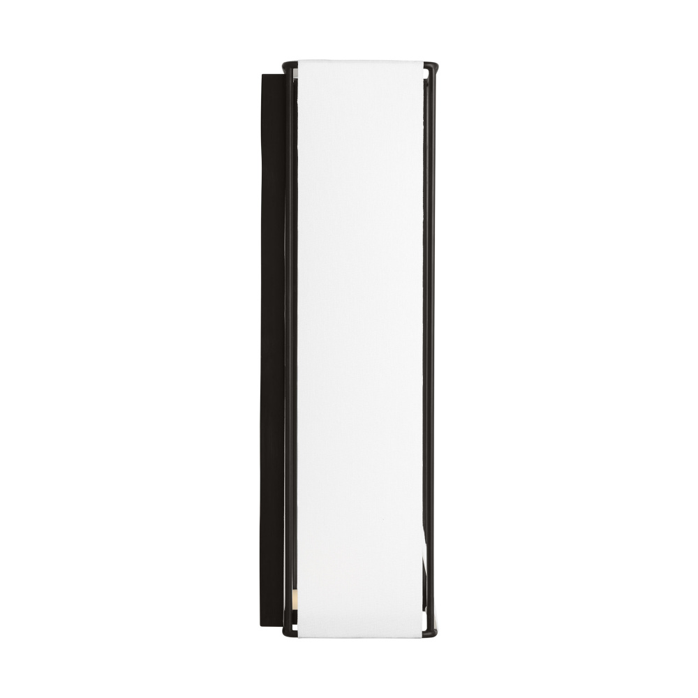 Crafted with Steel in a Aged Iron finish with white linen fabric shade