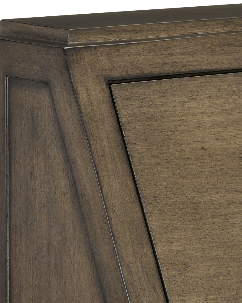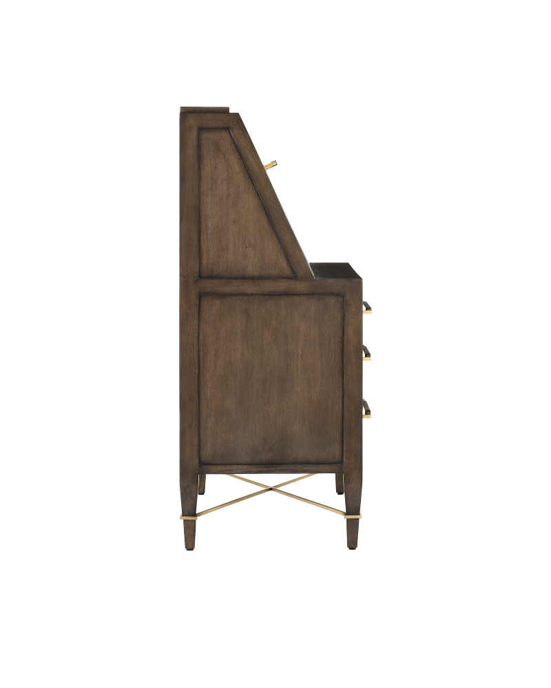 The Verona Chanterelle Secretary Desk is darkly handsome covered in a chanterelle finish with metal detailing in a champagne finish. The stretchers on this brown desk create added interest to enhance its flair. The beautifully detailed drawer pulls with centers that match the finish on the wood are gold on each end to enliven each drawer with their metallic sheen. The top folds down on this classic piece to reveal a desktop, a center-adjustable shelf, two fixed shelves, built-in power outlets, and two USB ports.