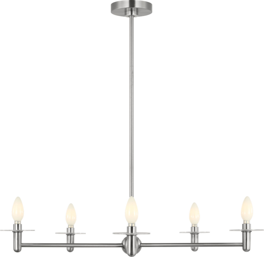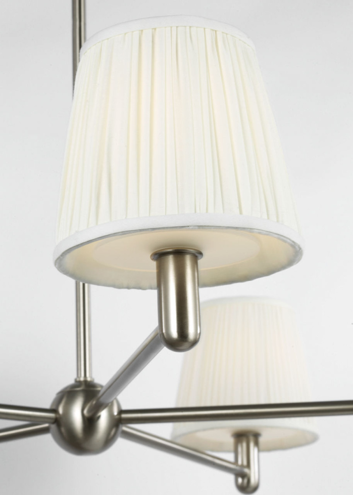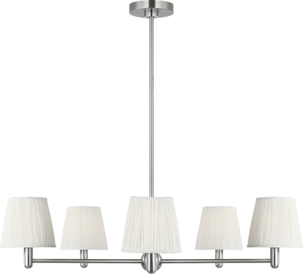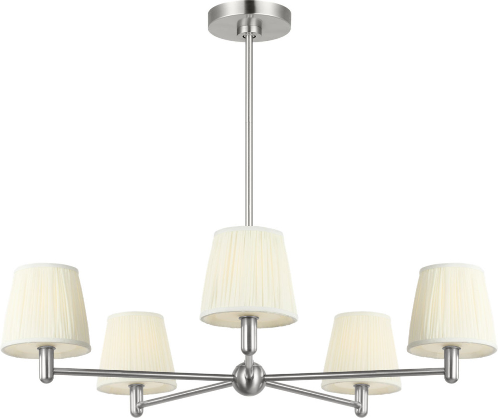 The Vilera 5-Light Chandelier features five white fabric shades set around a slender radial frame. Each shade diffuses light evenly, softening the geometric arms and creating a comfortable glow. Scaled for dining rooms, living areas, or bedrooms, this chandelier brings a balanced presence with a relaxed texture.