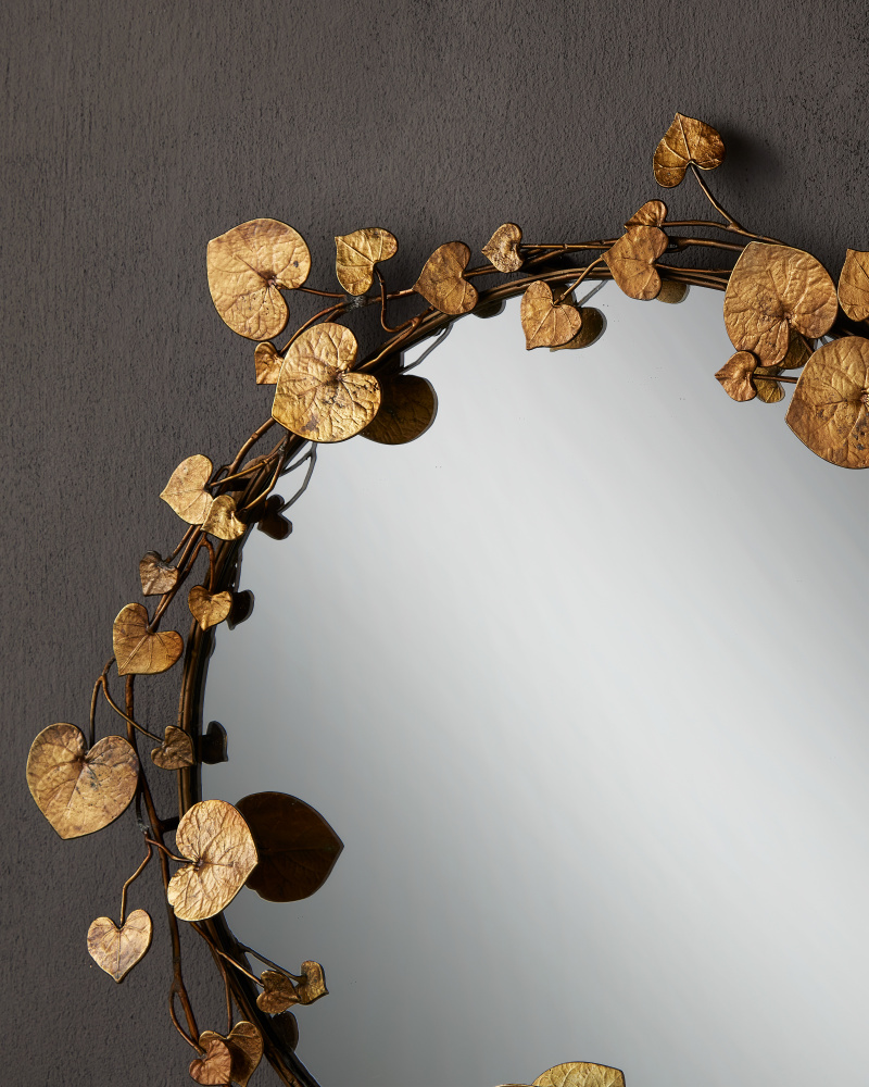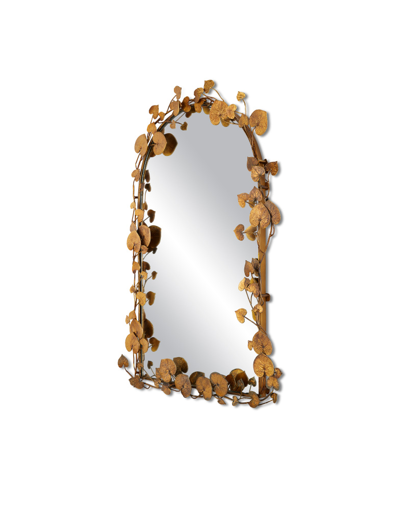 The vine of heart-shaped leaves flowing around the mirrored glass of the Vinna Arch Brass Leaves Mirror creates a playful display pulled straight from nature. The cast aluminum motifs in an antique brass finish have a subtle glow to them that makes this mirror a focal point on a wall. The vines are hand-shaped and the finish is hand applied on this decorative mirror.