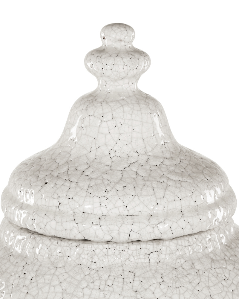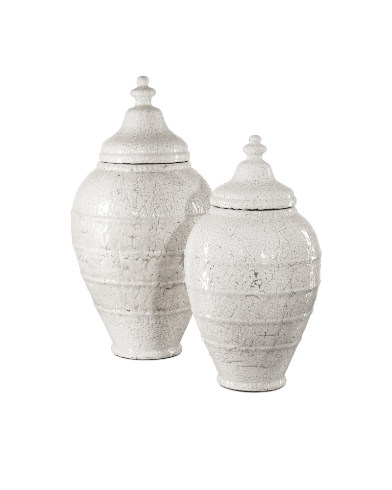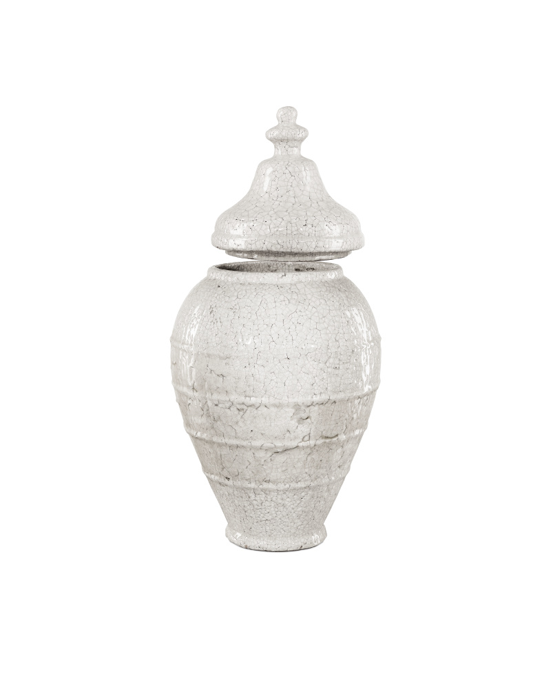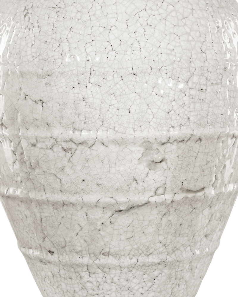 Mimicking the shapes of the terracotta jars that have historically been used for preserving olives in oil, the Virginal Large Jar is made of terracotta with an antique-white, hand-applied glazing that is so thick and rich it has a crackle surface. The fact that this piece is hand-thrown means the shapes will vary slightly, as will the finish, which will make each of these vessels unique. Someone who spies them in an interior could be convinced they are timeless antiquities.