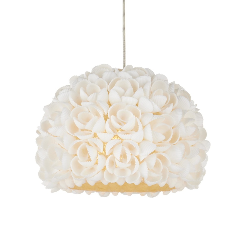 The Virtu 7-Light Rectangular Multi-Drop Pendant has beautifully composed shades around which clamrose shells are fashioned to look like rosebuds; each petal hand-placed to make this an artisanal offering. The way the illumination wafts through the shade and surrounds the shells is a design detail of note with this lovely nature-inspired luminary.