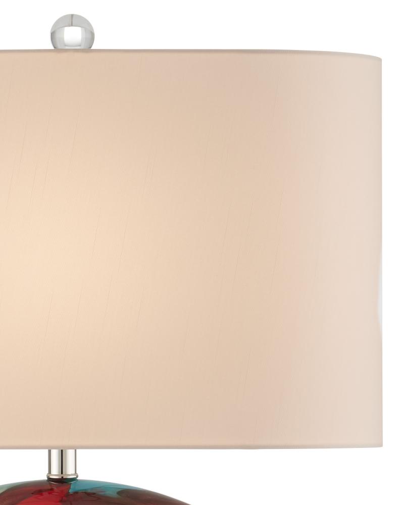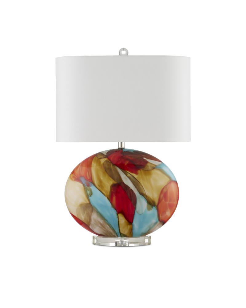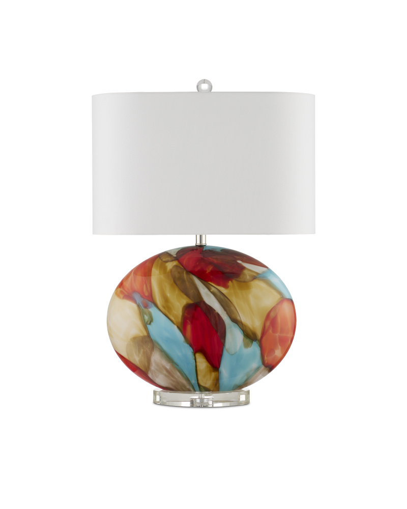 The Vivid Table Lamp lives up to its name with its swirling swaths of bright colors painted on its lozenge-shaped body. The multi-colored lamp glows even before it is fitted with an optic crystal base and finial, and polished nickel hardware. A polished design detail is how the shade is elongated in the same scale as the body and has rounded corners. The narrowness makes the lamp perfect for a spot where a fixture needs to sit close to the wall to free up tabletop space.