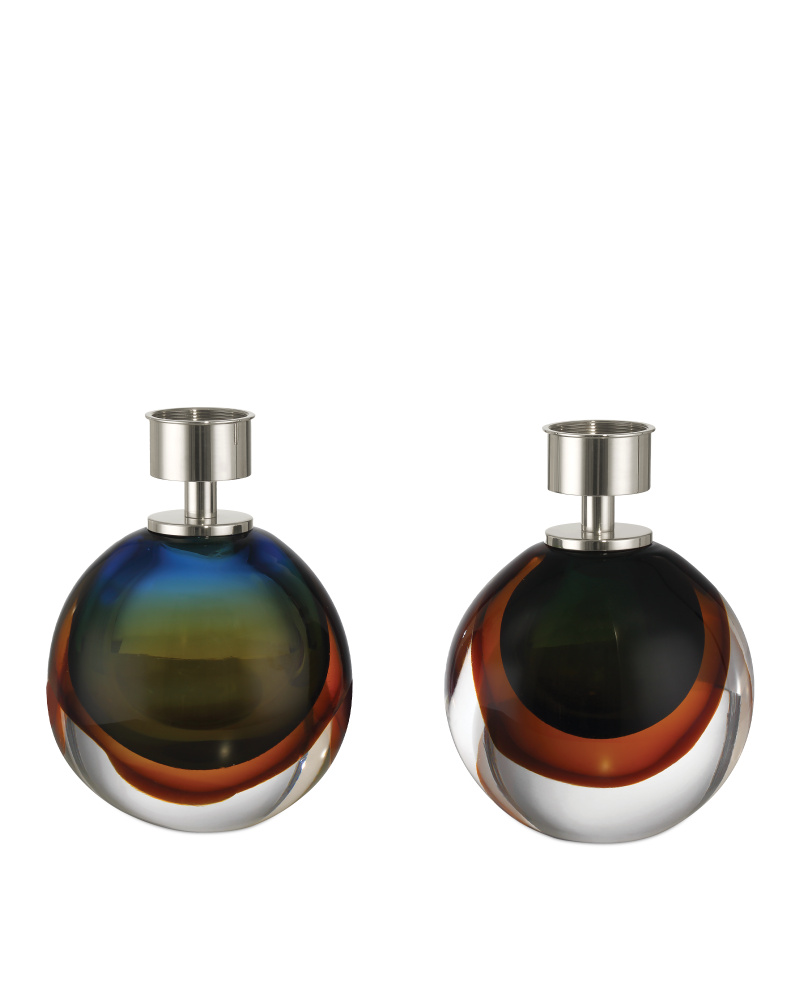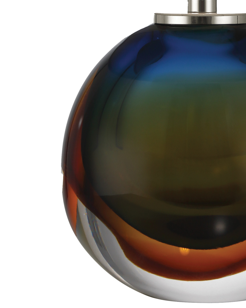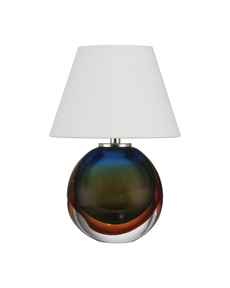 The Voyage Nickel Cordless Table Lamp is a luminous art-glass creation made of layers of glass: first blue is scooped up and blown, then amber is added to the mix, and then clear forms the top layer and realizes the beautiful orb shape. The layering of the first two creates a green effervescence in its center. The portable lamp with its rechargeable bulb configuration is topped with a fabric shade that sits atop polished nickel hardware. Each of the lamps, which look like elegant perfume bottles, will be slightly different because they are mouthblown.