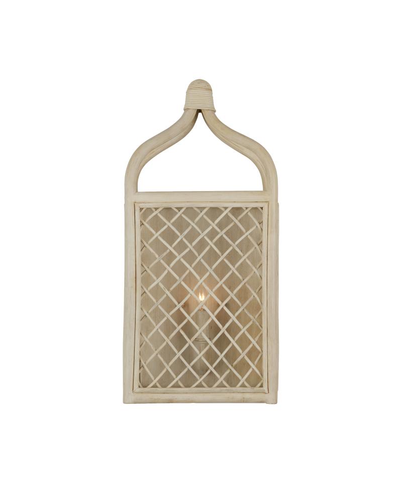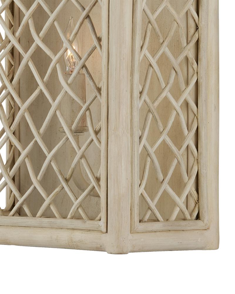 Achieving a traditional lantern shape entirely from rattan is a feat, one that was beautifully realized when artisans wove the Wanstead Ivory Wall Sconce from the natural material, slicing the normal depth in half while retaining the charm of the style. Both the thin and thick ribs intermingling to create the rattan lantern have been bleached to lighten the design. The antique Pearl finish on the hardware enhances the airiness of the beige sconce's profile.