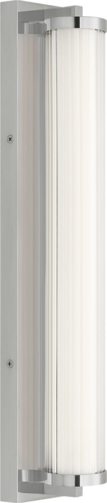 The Weston 22" Vanity combines linear symmetry with material depth, featuring a ribbed glass lens framed by a full-length metal backplate. Dedicated LED technology delivers efficient, ambient light while the textured diffuser enhances clarity and softens glare. suited for horizontal mounting in bathrooms and powder rooms where diffused illumination and visual structure are required.