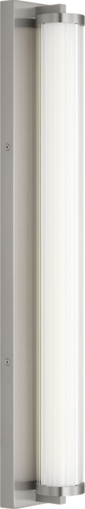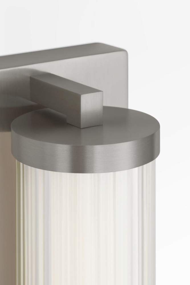 The Weston 28" Vanity combines linear symmetry with material depth, featuring a ribbed glass lens framed by a full-length metal backplate. Dedicated LED technology delivers efficient, ambient light while the textured diffuser enhances clarity and softens glare. suited for horizontal mounting in bathrooms and powder rooms where diffused illumination and visual structure are required.
