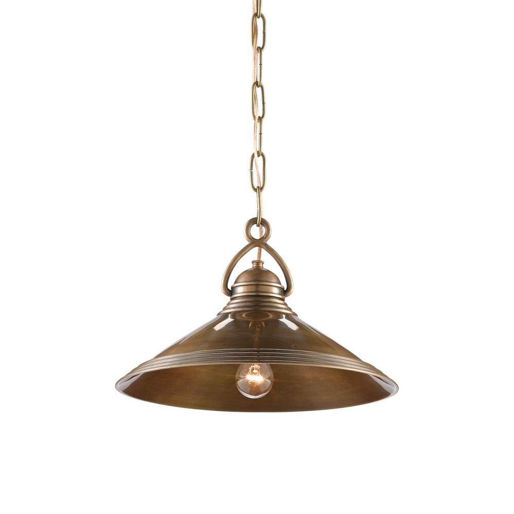 Our new Weybright Pendant references so many vintage industrial notes, it will have a nuts-and-bolts appeal to anyone who still dreams of the days of steamer ships and the local butcher who cleaved the freshest of meats to beams in his chill locker. Made of brass that has been treated to a vintage brass finish, the design notes that make this luminary so special are the sophistication of the shape of the hook that fastens the fixture to the chain and the ribbed details on the shade.