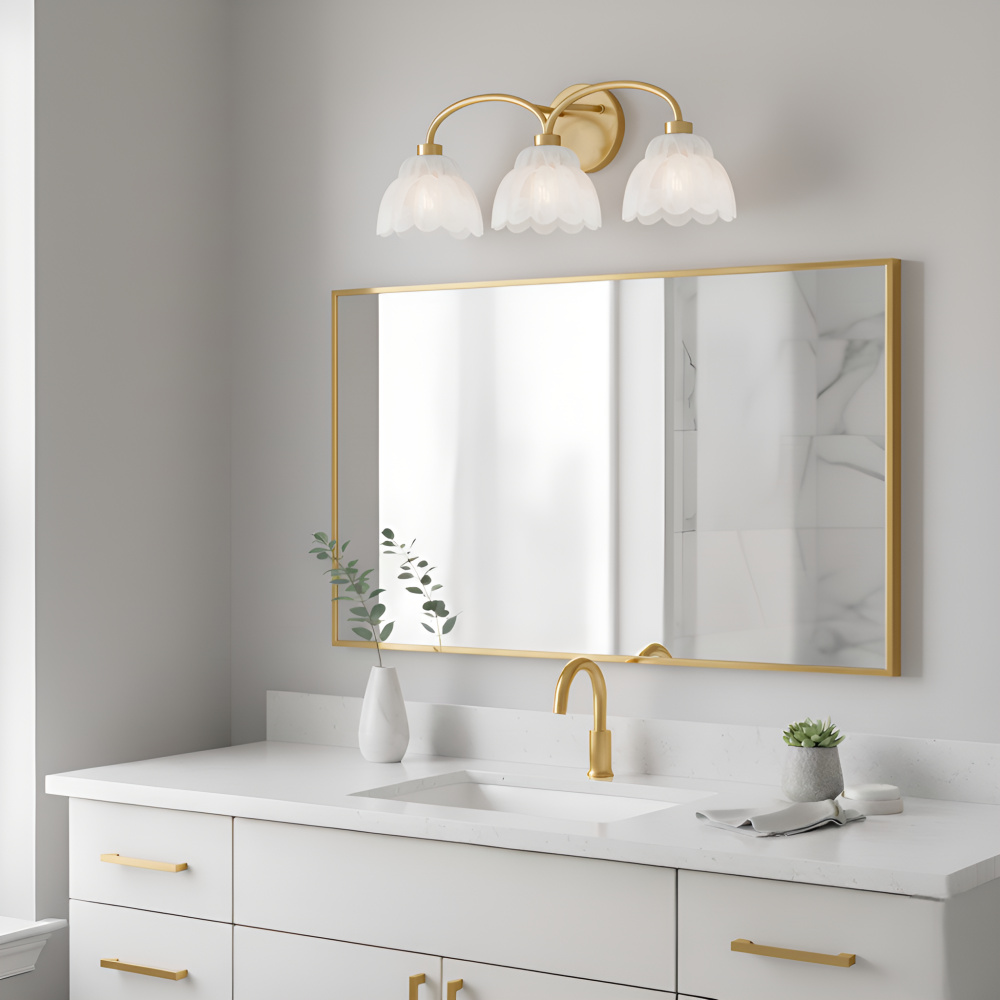 Delicate curves and sculpted glass give the Whitecap Vanity Light a quietly elegant presence. Whether in brushed gold with alabaster glass or mottled cocoa with amber glass, each finish brings a different mood—soft and luminous or warm and dramatic. Perf