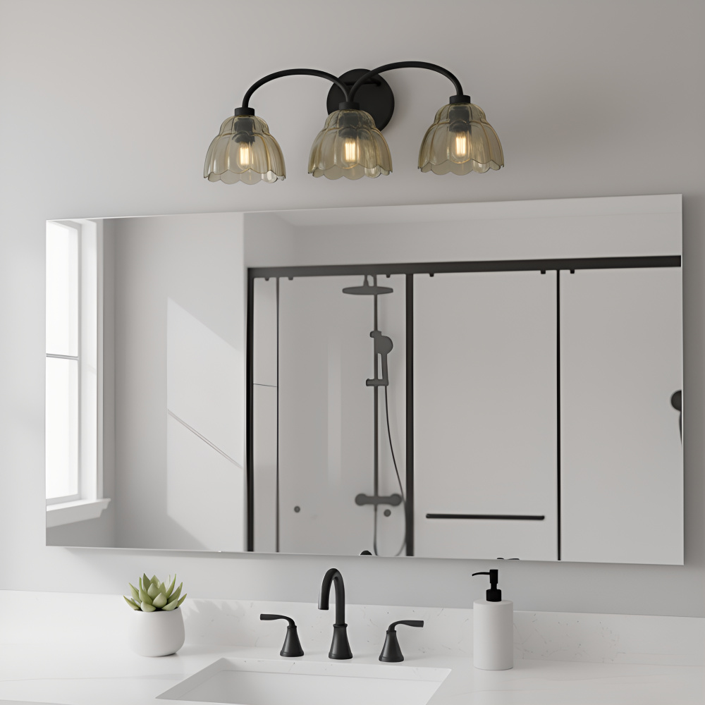 Delicate curves and sculpted glass give the Whitecap Vanity Light a quietly elegant presence. Whether in brushed gold with alabaster glass or mottled cocoa with amber glass, each finish brings a different mood—soft and luminous or warm and dramatic. Perf