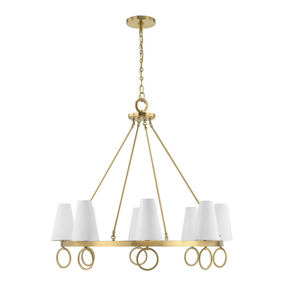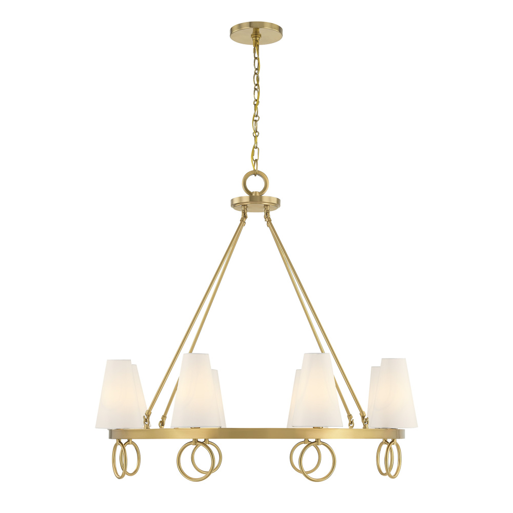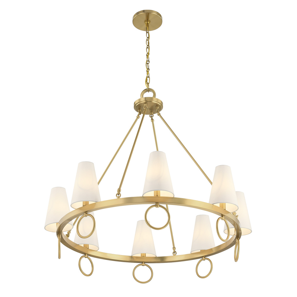 The Savoy House Wilkes 8-light chandelier, designed by award-winning interior designer Dann Foley, blends classic geometry with graceful detailing. Its open wagon wheel silhouette is accented by decorative rings and finished in Warm Brass, creating an architectural presence softened by conical white fabric shades. Wilkes is 32.75" in height and 36" in width. It uses eight candelabra size bulbs of up to 60 watts per bulb. Bulbs not included. Comes with 120" of chain.