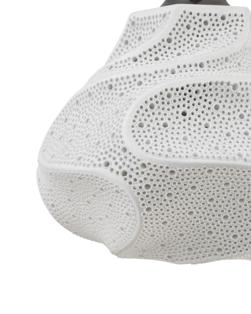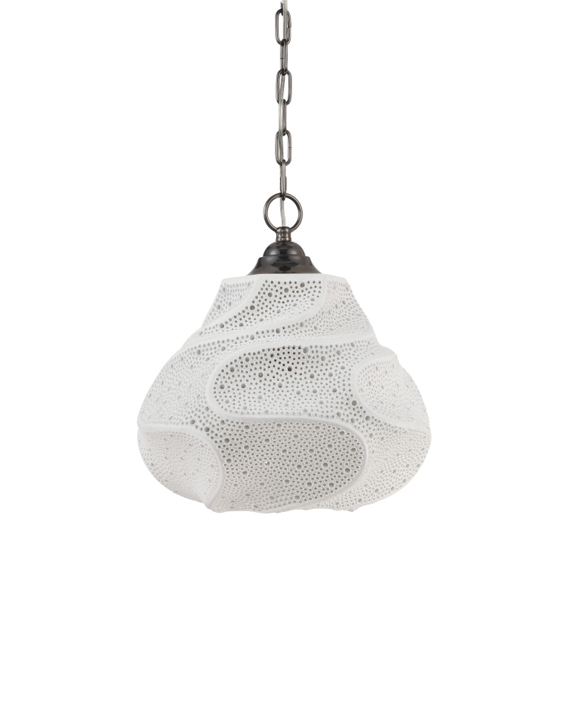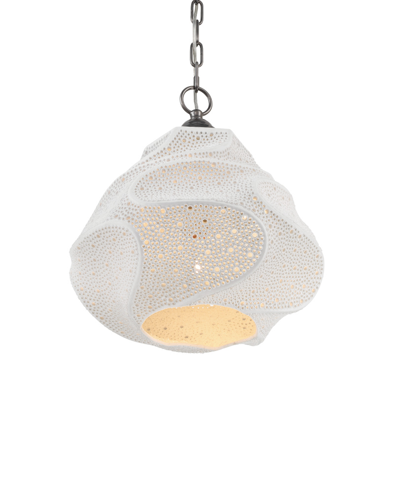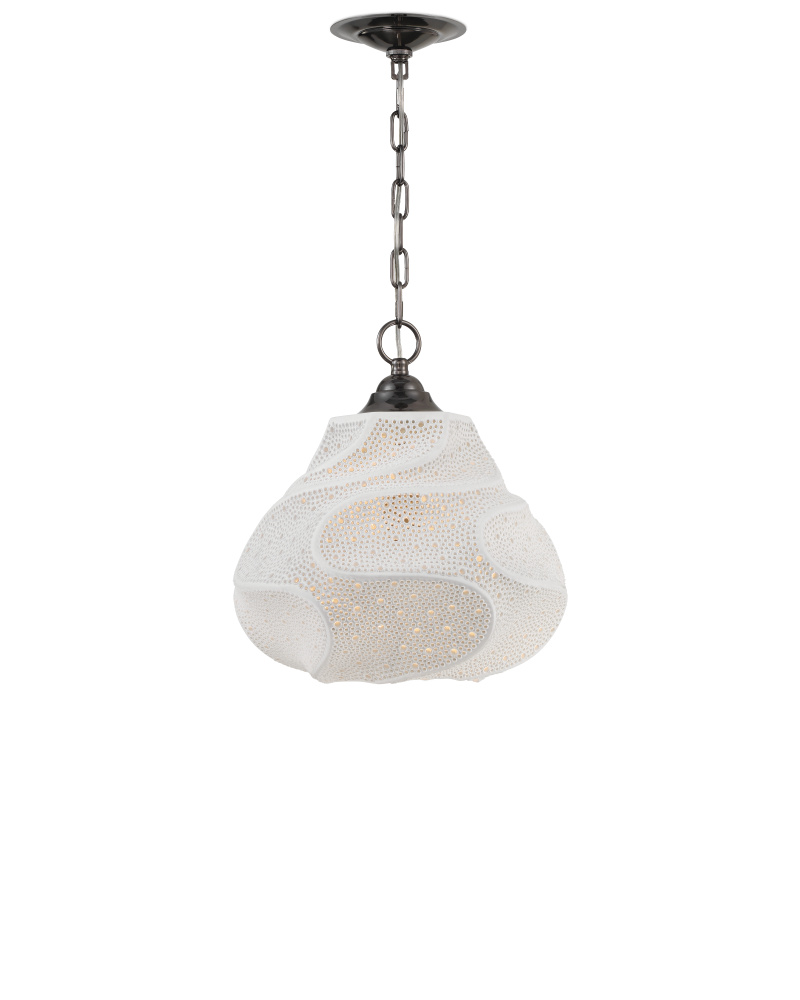 The Wintershall White Pendant has an organically-shaped shade with a flowing pattern that is painstaking to achieve. The porcelain comes from the kiln as a solid form that is then hand-drilled with two sizes of holes; the uniformity the artisans produce when they are creating the openings very difficult to do. The one-light pendant is dimmable. Adjustable from 21.75" to 89.75" with use of included chain/rod kit/cable. If your space calls for a longer drop, additional chain/rods/cable is available for purchase.