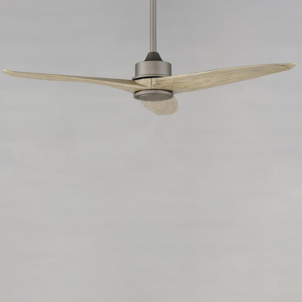 Solid Wood blades curve as they rotate around a center housing with LED light kit included. An additional cover plate is included if the light kit is not used. Select from stylish finish combinations including Natural Aged Brass with White Wood, Satin Nick