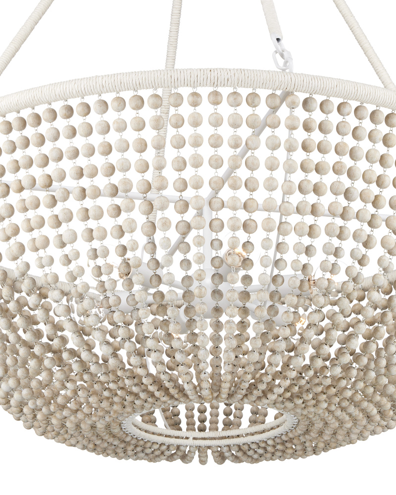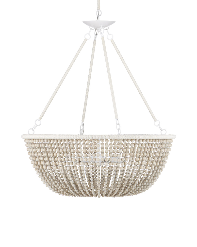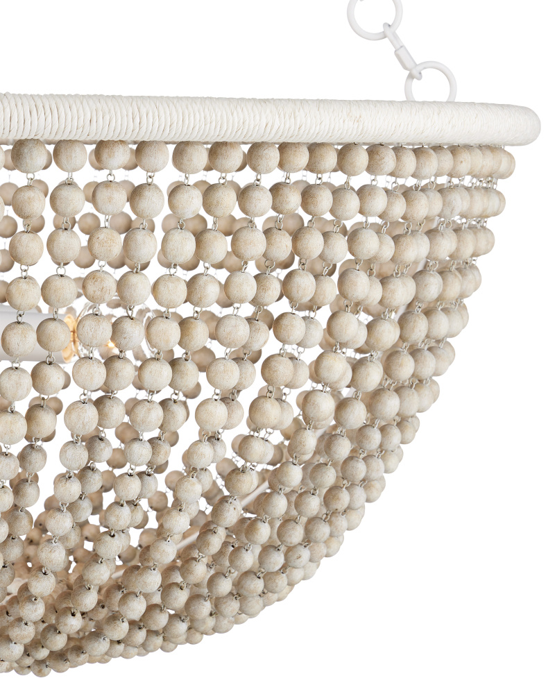 The Wychwood Chandelier is a classic shape that holds swags of wooden beads between its top and bottom rings. Several materials and finishes are in play on this design -- the sugar white finish on the wrought iron, the sandstone finish on the beads, and the Kraft paper twine wrapped around the rings themselves. Adjustable from 42.25" to 123" with use of included chain/rod kit/cable. If your space calls for a longer drop, additional chain/rods/cable is available for purchase.
