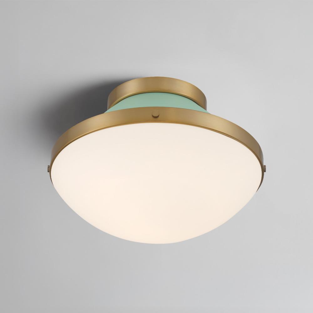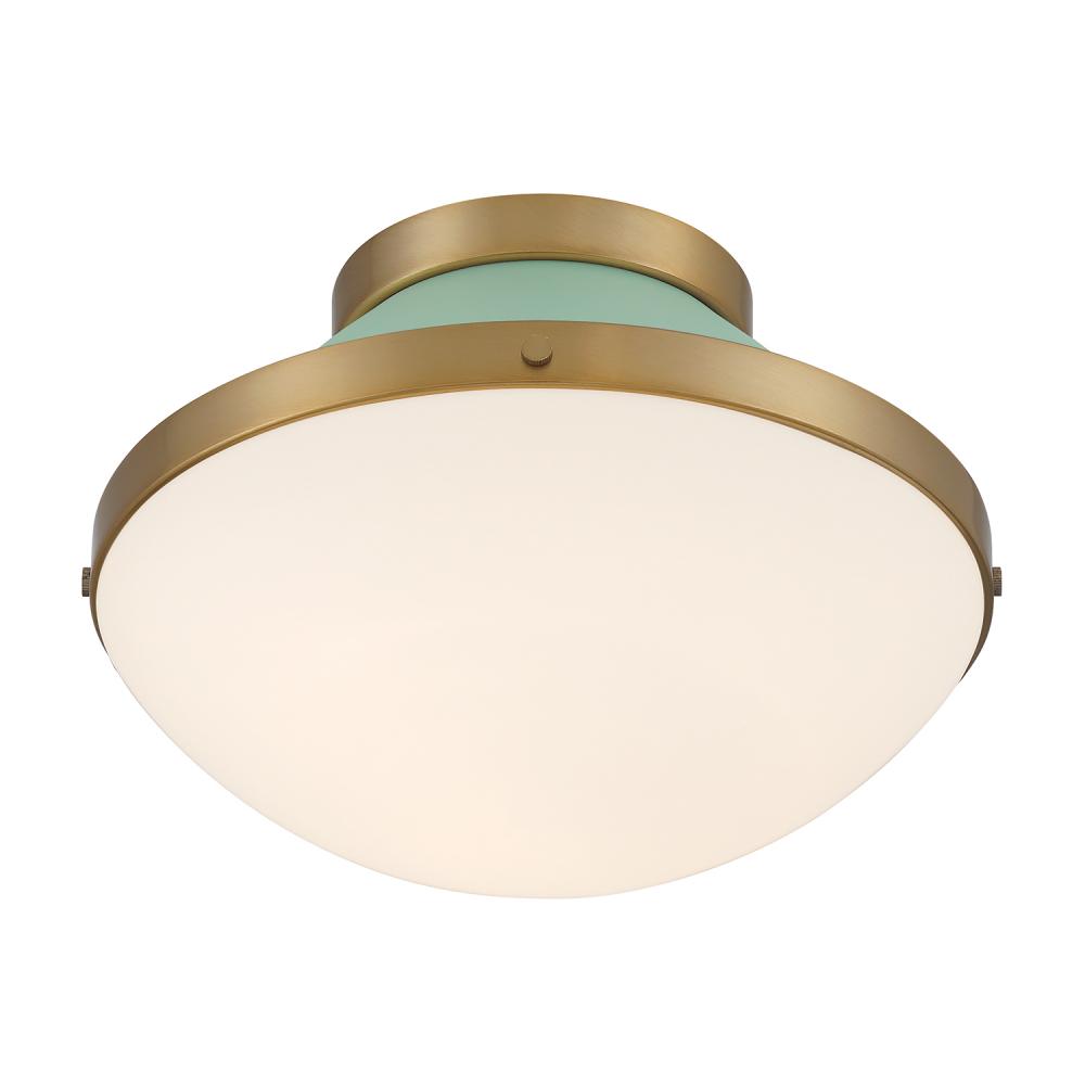 The Xander collection features a playful, mid-century-inspired design with clean lines and fun pops of color. It has white opal glass and gold accents, creating a two-toned finish that adds a touch of whimsy. This versatile fixture can be used in various settings, making it a stylish and functional addition to any room.