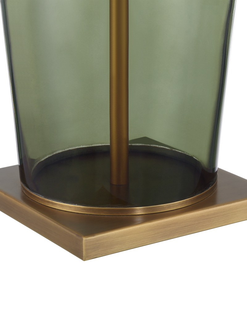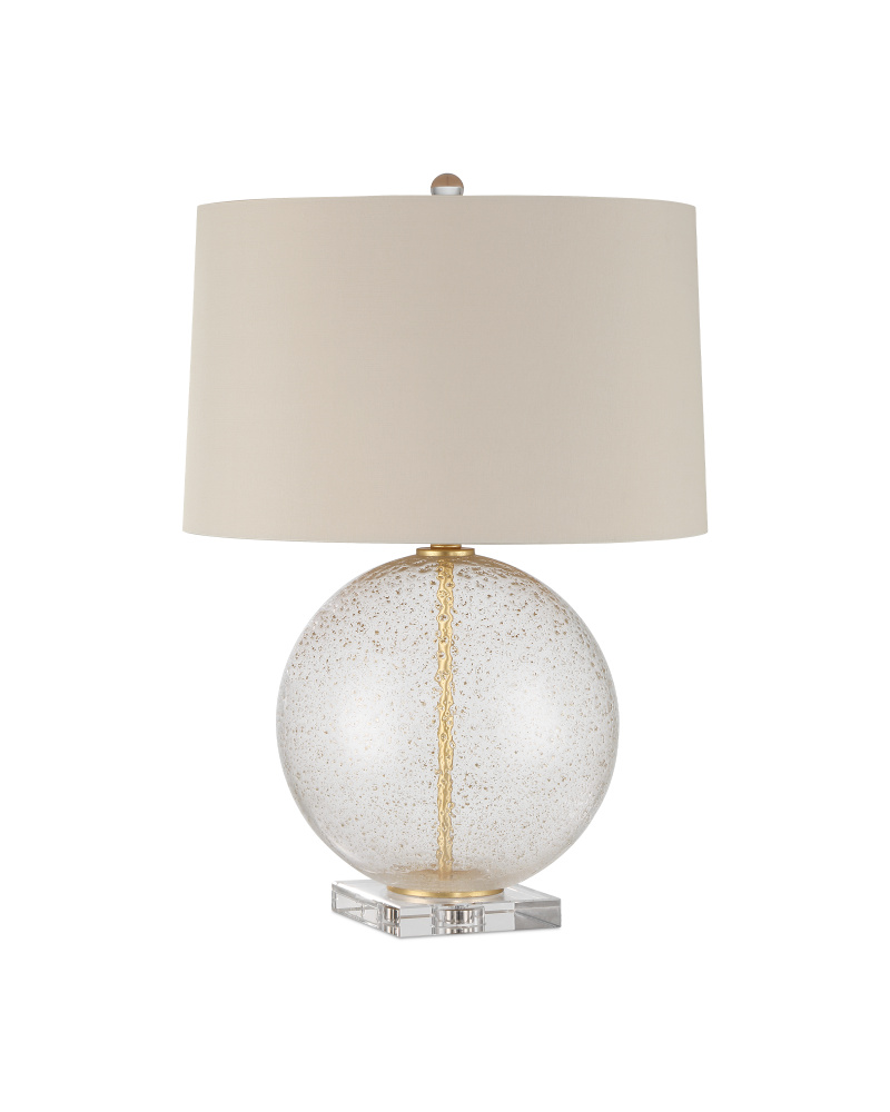 The orb shape of the Zebulon Round Table Lamp is made of mouthblown stippled glass that has incredible texture for a clear glass piece due to the gold flecks that were embedded in it when it was created. Sitting atop an optic crystal base, which is equally shimmering, the glass lamp has hardware in a contemporary gold leaf finish that also gleams. The lamp is topped with an optic crystal finial.