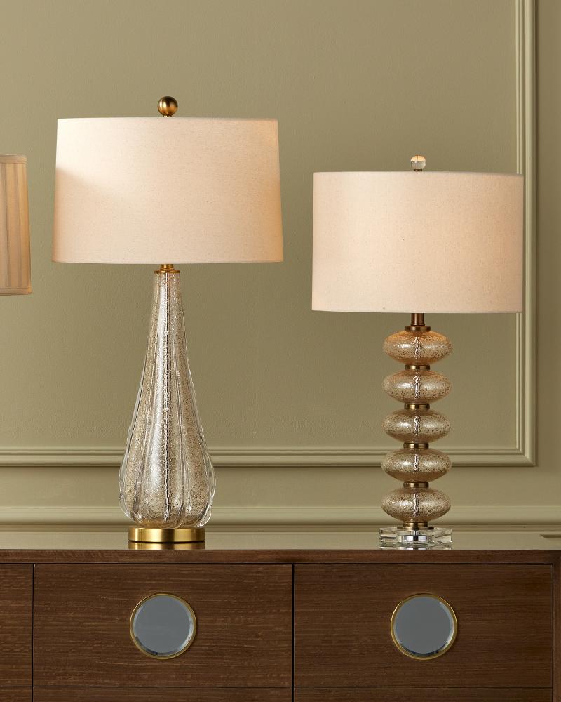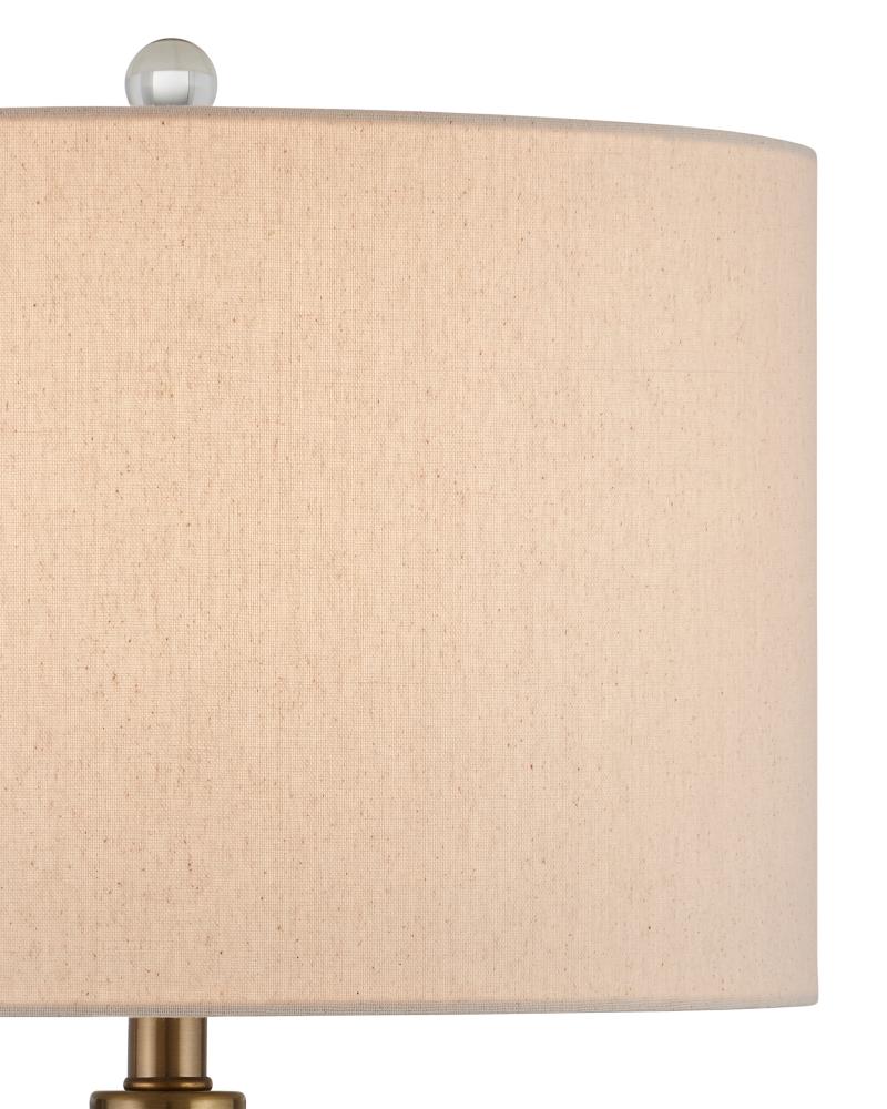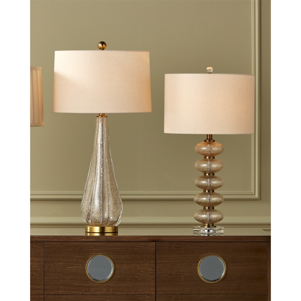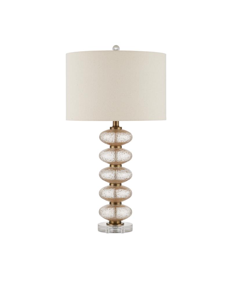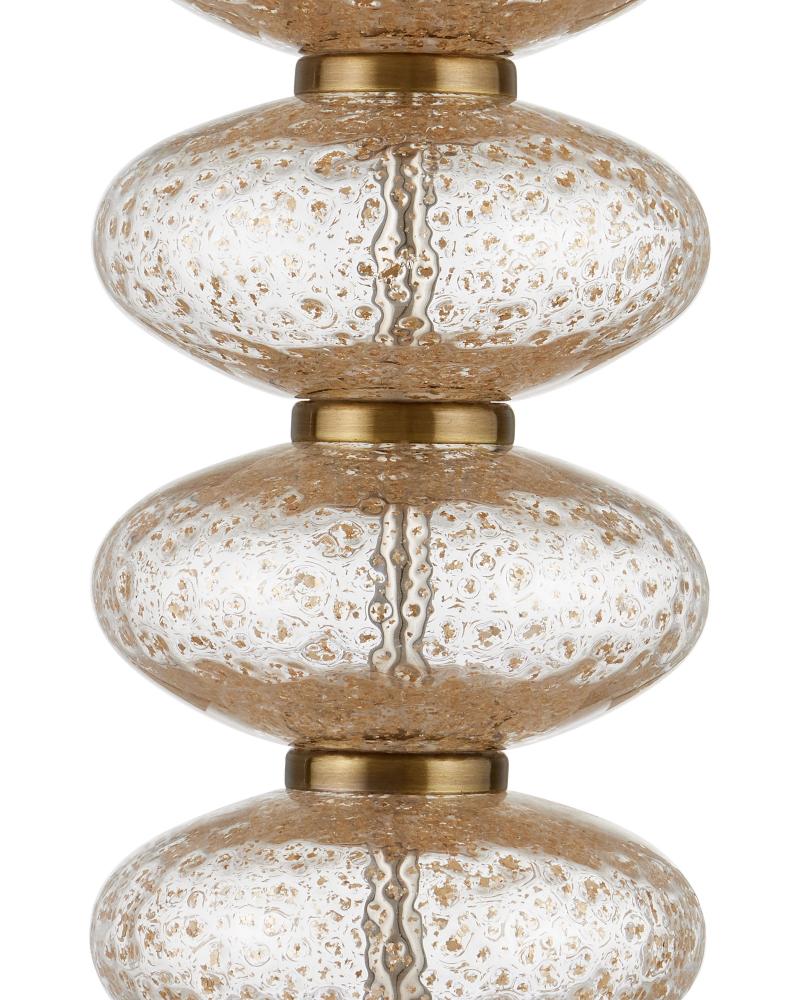 With its beautifully realized stippled glass globes that have been pressed into oblong shapes, the Zebulon Table Lamp is an artisanal wonder. The antique brass metal rings that sit between the glass elements draw out the gold speckles in the glass, and the optic crystal base and finial echo the freshness of the clear glass orbs. Because the blown glass has so much personality, this clear lamp will be a glamorous decorative element in a room.
