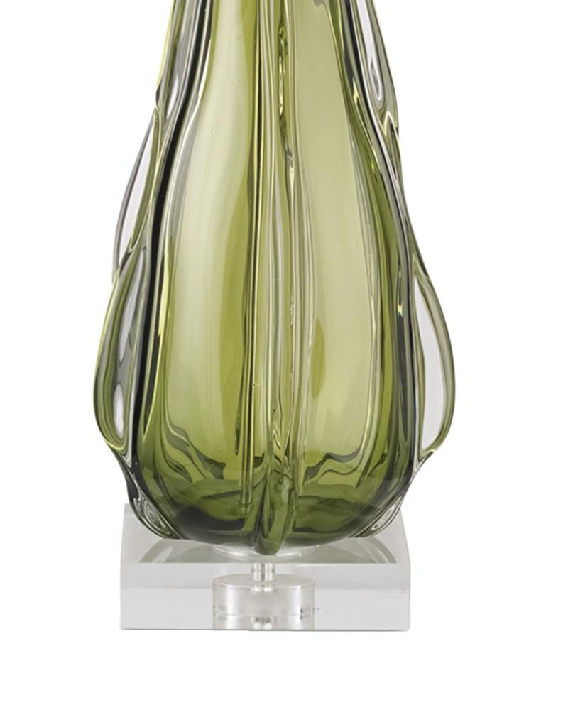 The undulant body of the Zephyr Table Lamp is organic and sculptural. The smoky green color of the glass comes to life when illumination flows onto its surface from under the off-white shantung shade. The green glass lamp sits atop an acrylic base and is fitted with a clear finial.