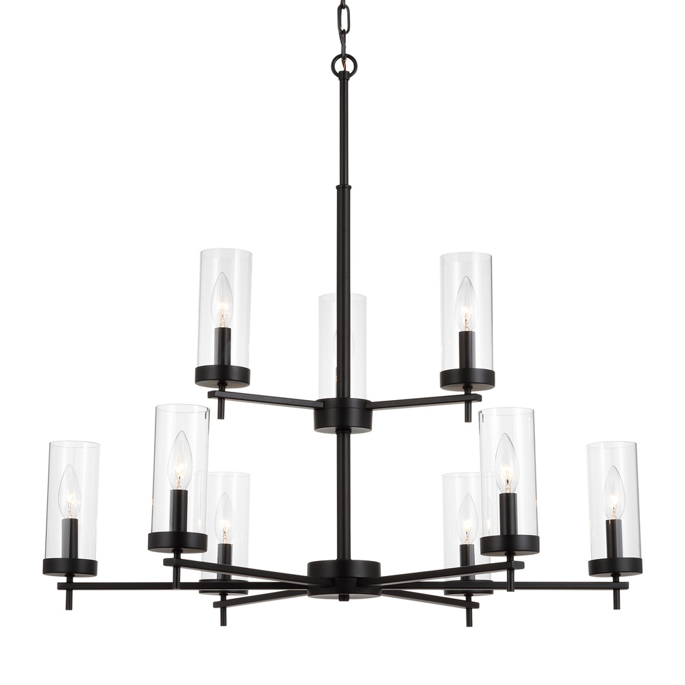 The Zire nine light multi-tier chandelier in Midnight Black finish embodies simple clean lines that strike a perfect balance of elegant yet minimalist design. Each of the lights sits on the round bottom rim, featuring an Edison-inspired design highlighted by a cylindrical glass shade. The assortment includes nine-light, five-light, and three-light chandeliers, a five light linear, one-light large and mini-pendants, and one-light, two-light, three-light and four-light wall/bath fixtures. A stylish and elegant addition to any room in the house. Zire is offered in a Brushed Oil Rubbed Bronze, Brushed Nickel, Chrome, Satin Brass or Midnight Black finishes.