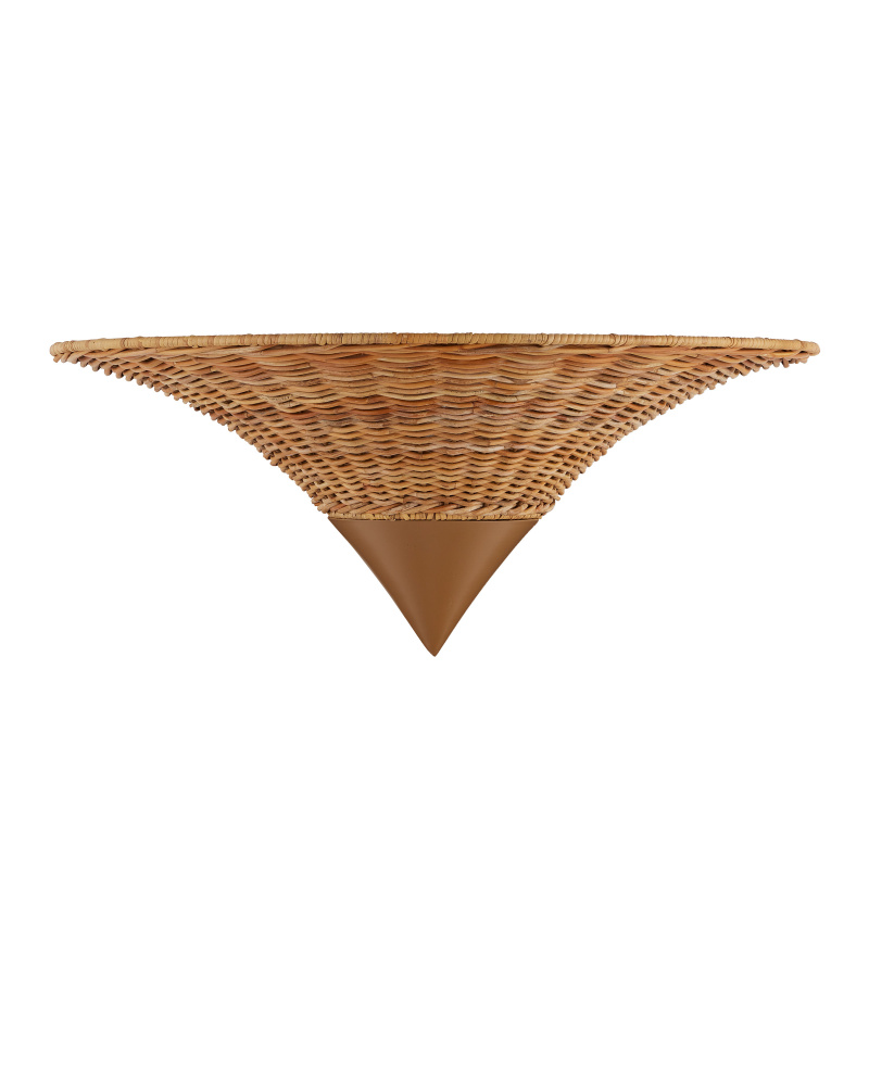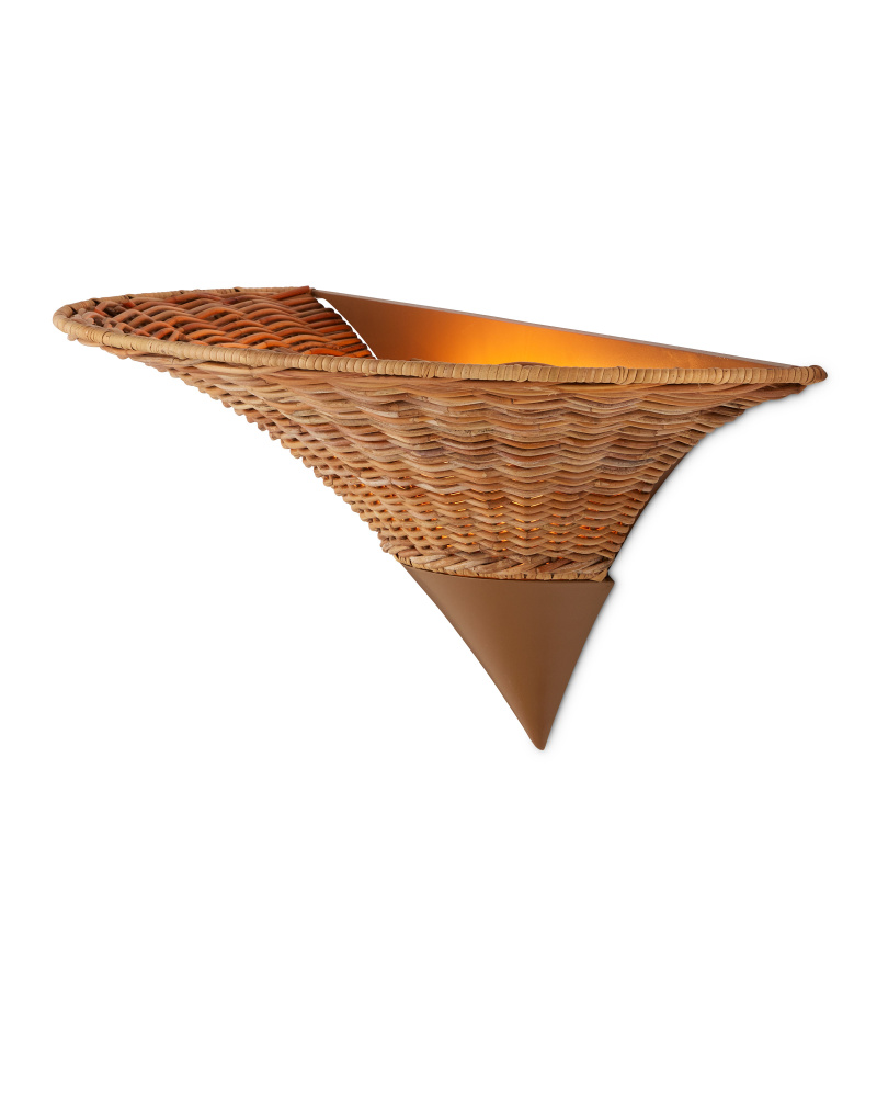 The Zola Wall Sconce is made of beautifully woven natural rattan and wrought iron in a khaki finish. Though it is made of an earthy material, the clean lines of the shape make this a contemporary rattan sconce. The expert weave includes tightly wrapped detailing on the top edge of the sconce and the ring where the rattan meets the metal cap at the bottom. The fixture is fitted with a backplate in the same finish that brings the illumination a warm glow.