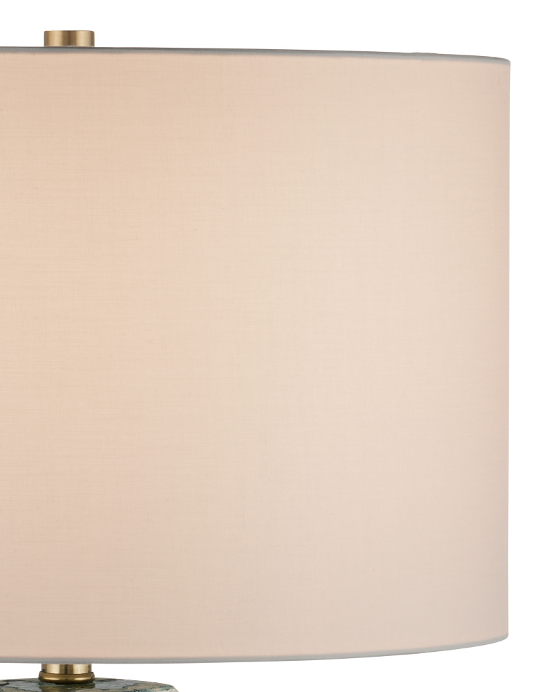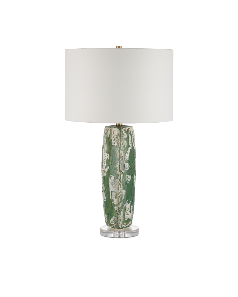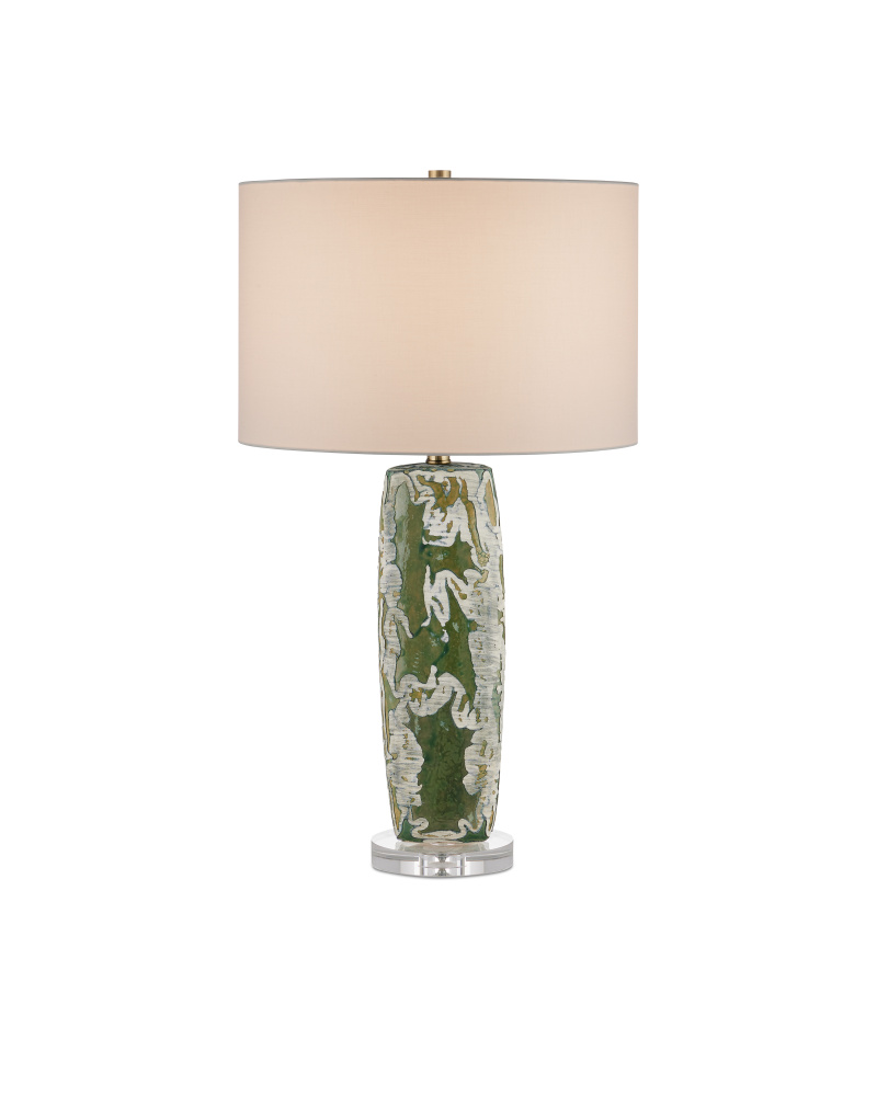 The Zowan Table Lamp is made of ceramic in a matte green smoke glazing flowing along its surface that looks like a genealogical map. The cream that overlays the green has been hand-applied to bring the lamp an artful feel, and the optic crystal base from which the fixture rises leaves the painterly column to be the focal point of the design. One of the interesting things about this green lamp is that the pattern will change slightly when seen from different angles.