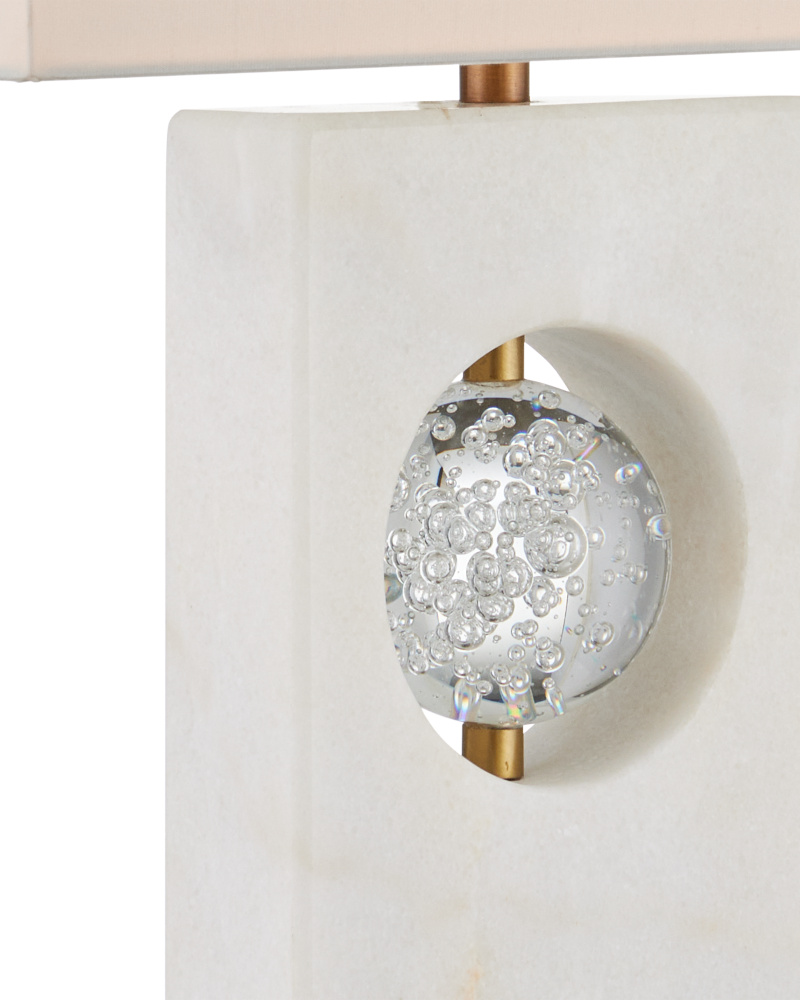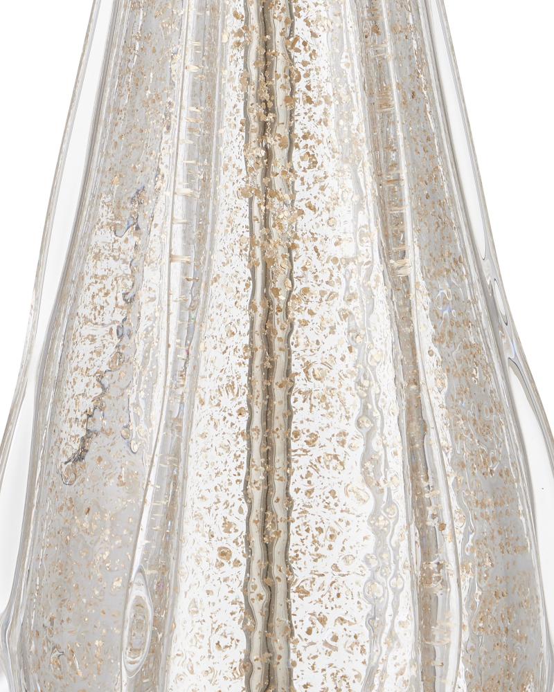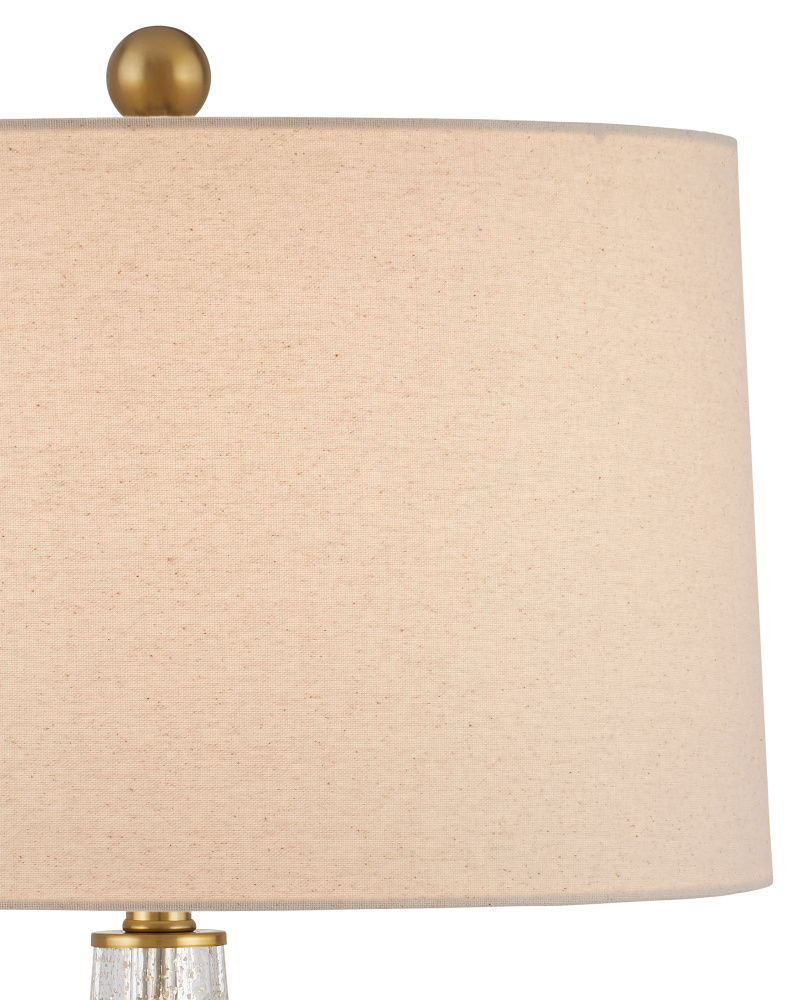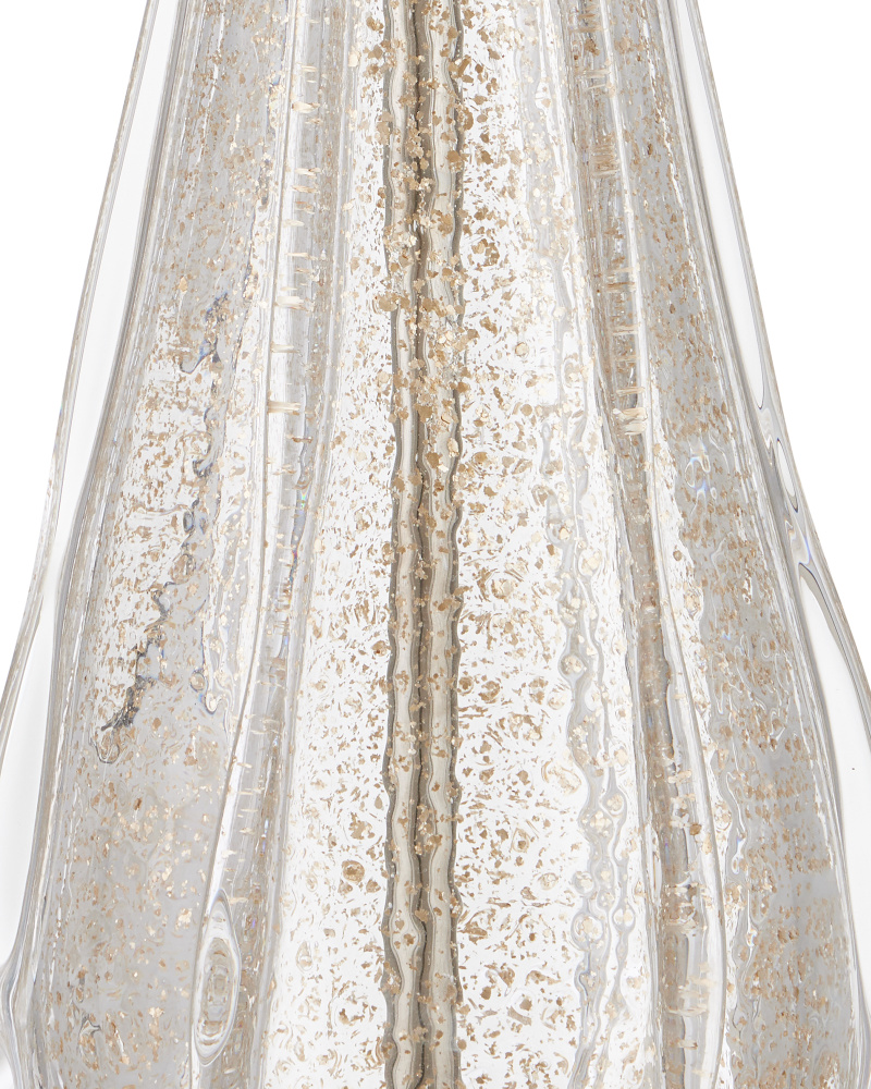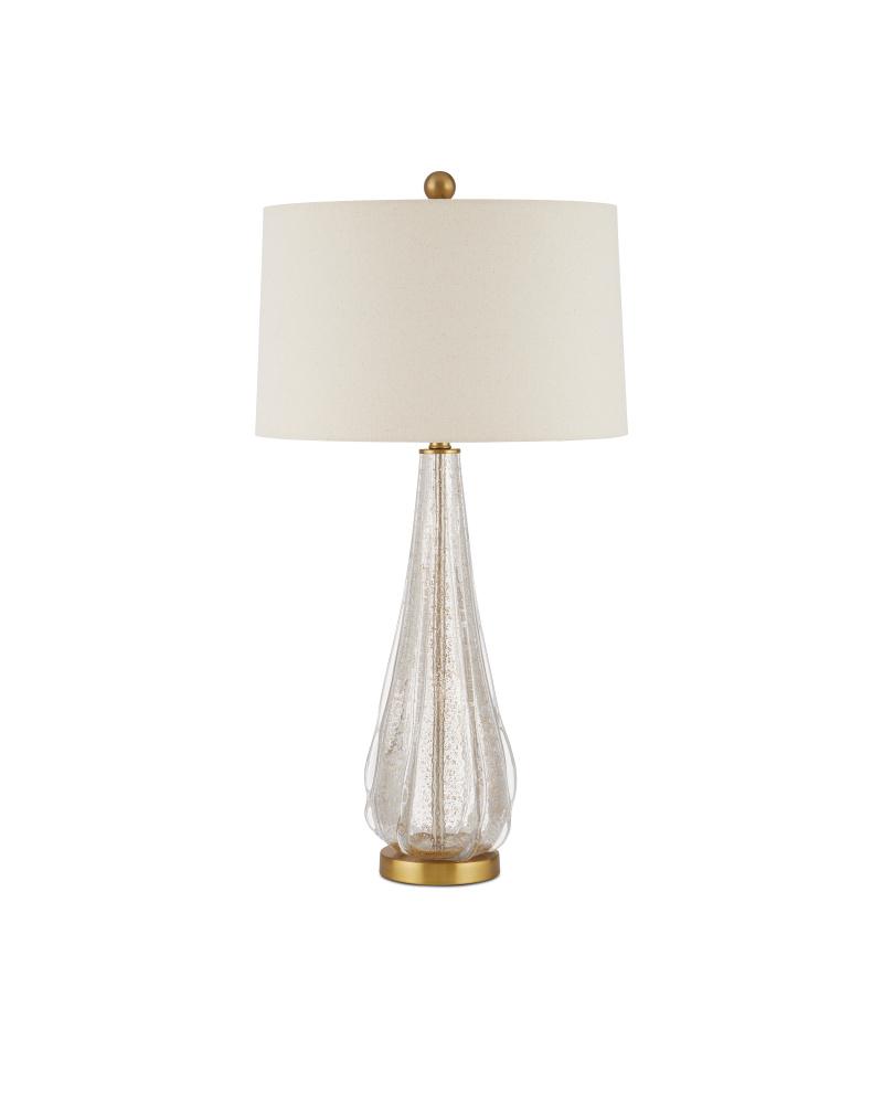 The Zyphyrine Table Lamp has a striking fluidity that stems from the flowing shape of the body that is made of blown glass. There are gold speckles sprinkled throughout the material, which adds a subtle textural feel to the clear lamp. The antique brass on the metal base and hardware draw out the flecks in the glass, as does the finial in the same finish. Because blown glass is so unique from creation to creation, there will be subtle differences in each of these fixtures.